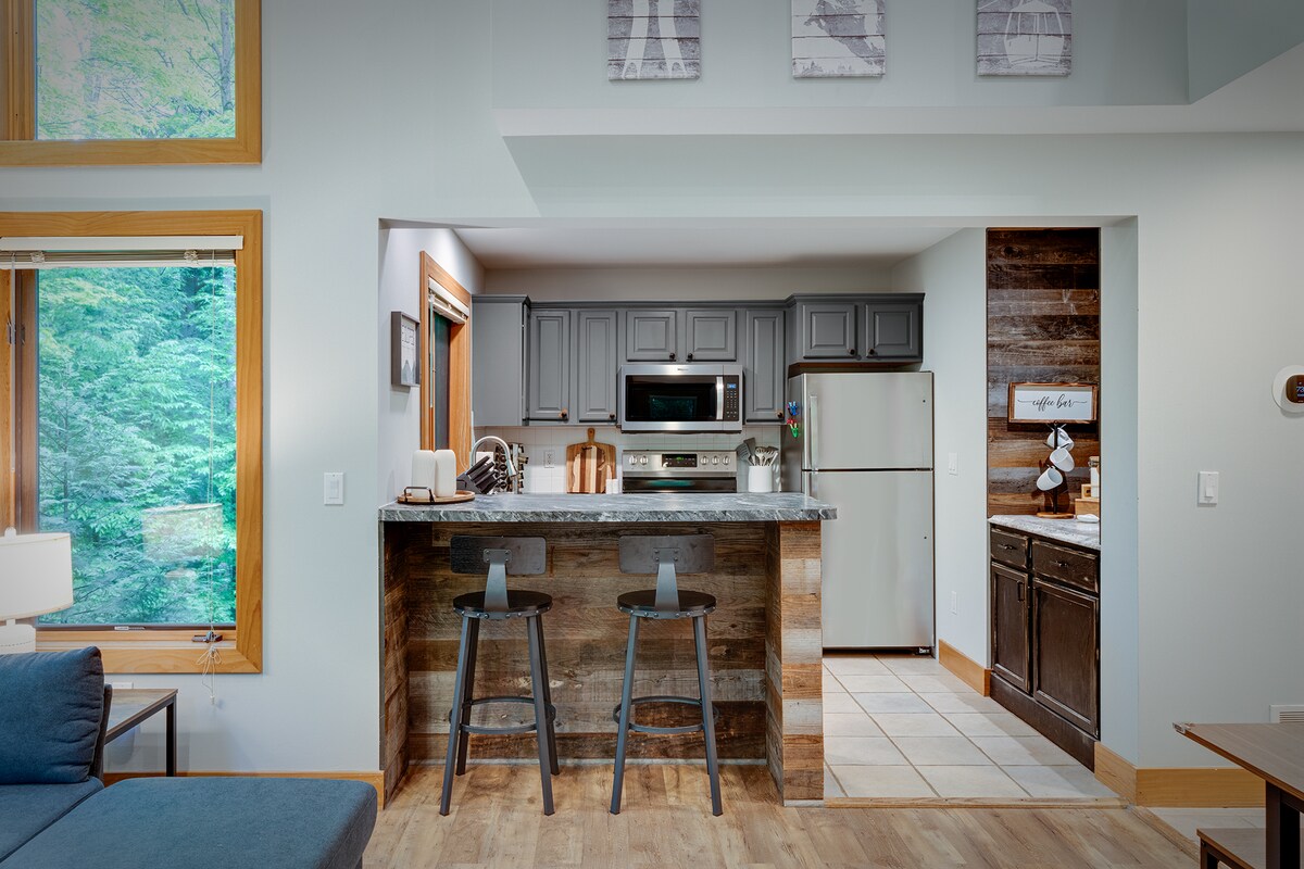 Bain sult as an gcábán nua-aimseartha, 2 leaba, 2 sheomra folctha, Austur! Ideal do theaghlach agus do chairde, cuireann an Retreat stylish comforts luxe le charm tuathúil agus is féidir é a fháil ar cíos le cábán comhionann béal dorais. Seomraí codlata suaimhneacha agus lochtaí beaga codlata ina bhfuil línéadach tí bog agus piliúir phluise, cistin lánfheistithe, áit chónaithe theolaí, póirse mór clúdaithe, poll dóiteáin cois coille, agus luchtaire feithiclí leictreacha. Nóiméid ó Downtown Petoskey agus tá sé ar fáil, ach i suíomh síochánta ciúin! Níl aon liosta anróiteach don tseiceáil amach!