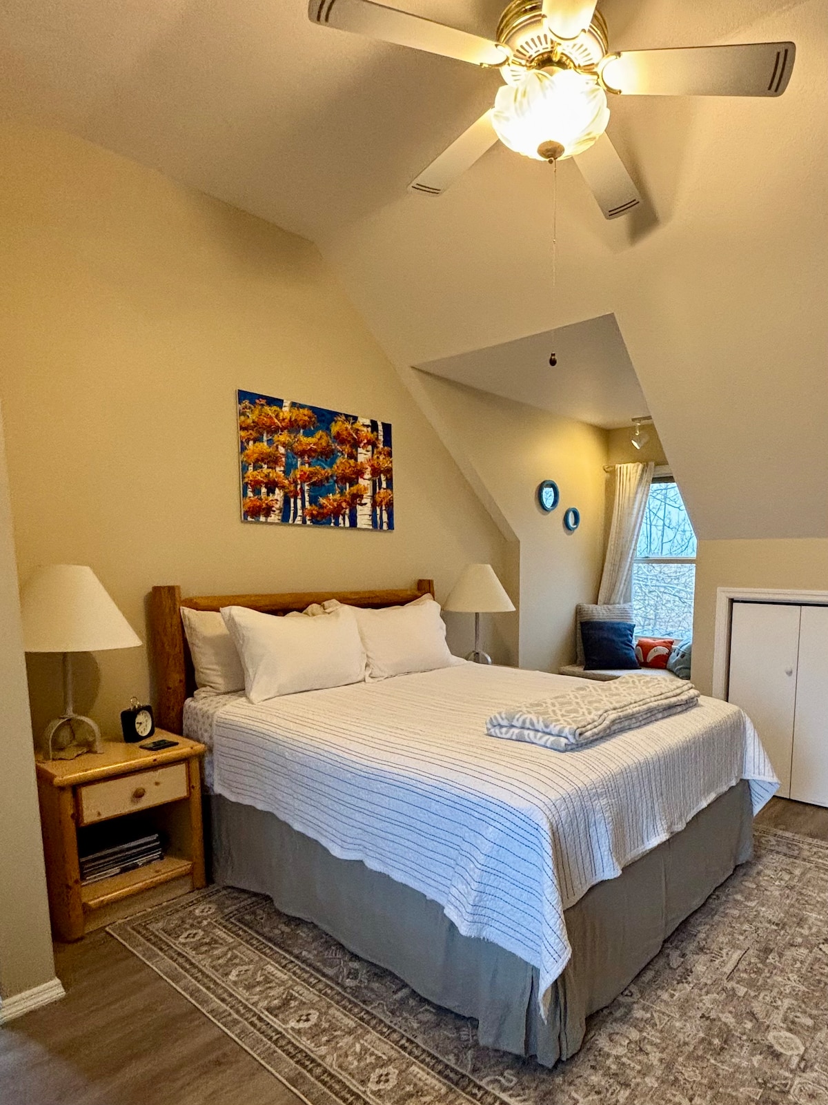 Tá bealach isteach príobháideach, cistin lán-ghlactha, cith/tub, leithreas iata, leaba bhanríona agus leaba chaol dhá dhuine, aerchóiriú, teilifís le sruthú . . . agus luascán laistigh inár Loft spraíúil faoi sholas na gréine! Tá beárbaiciú & tábla bia lasmuigh + dhá rothar, bróga sneachta agus meaisín níocháin/triomadóir iomlán agus folcadán 2ú leath sa gharáiste. Tá páirceáil ar an gcabhsa againn d'aíonna Loft, agus níl iontu ach bloic ón Ollscoil & ó lár stairiúil. . . & BTW, déanaimid AirBnB an príomhtheach freisin: airbnb.com/h/montana-mediterranean