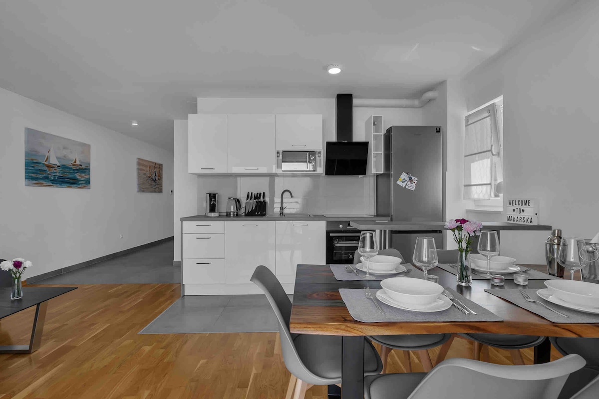 Tá árasán úrnua, álainn, geal le radharc iontach ar urlár uachtarach foirgnimh árasáin in Makarska romhat. Anseo is féidir leat taitneamh a bhaint as na buntáistí a bhaineann leis an mbaile trá creathach seo sa samhradh nó an baile fionnuar seo atá leagtha siar le neart beáir agus bialanna caife sa gheimhreadh, gan do chompord a íobairt. ou gheobhaidh tú árasán nua - aimseartha sómasach le hardaitheoir agus dhá bheart páirceála do do charranna. Tá an chistin ardchaighdeáin feistithe go hiomlán, le gach rud a theastaíonn uait.