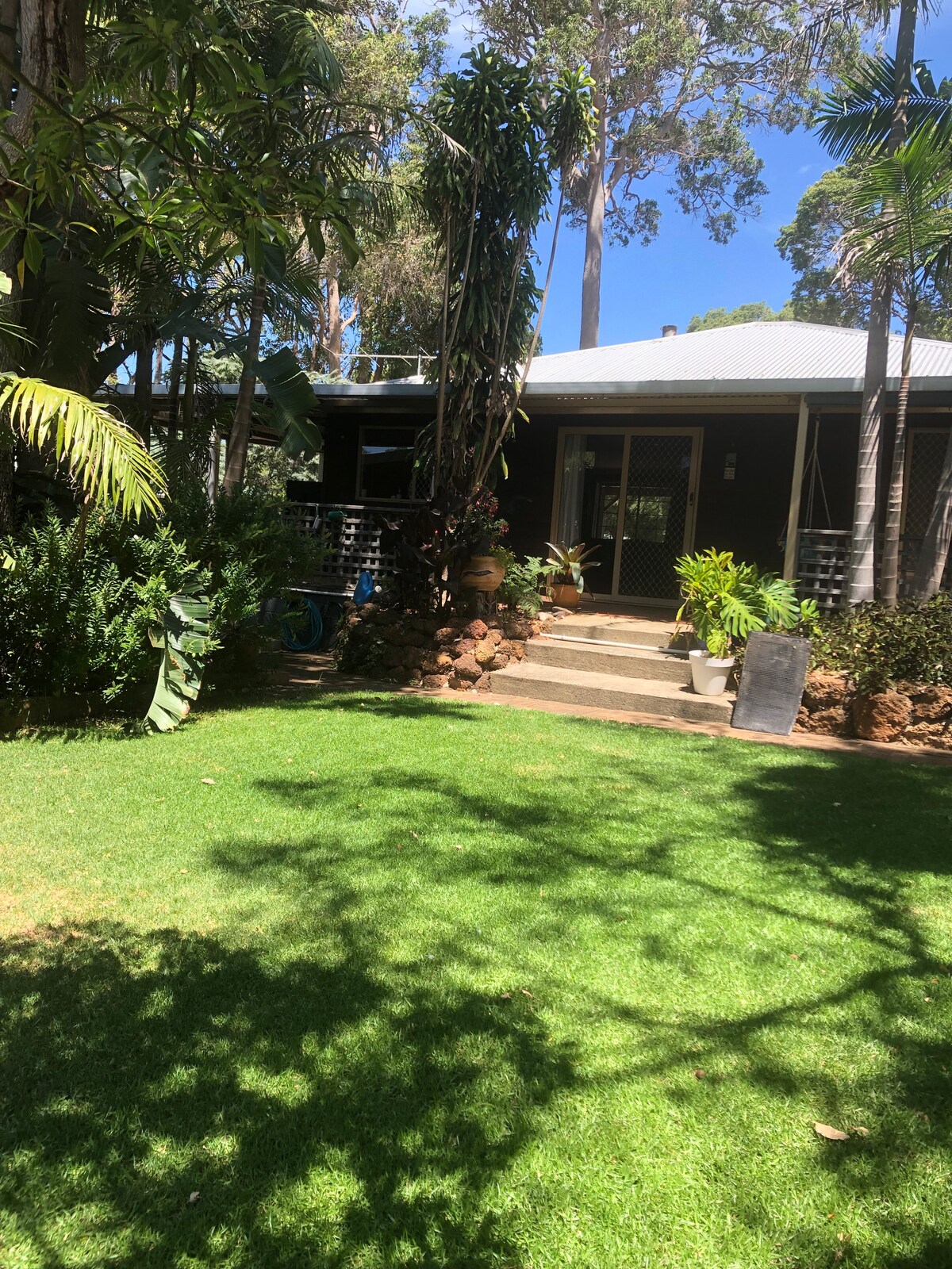 Teachín taibhseach dhá sheomra leapa bale tuí ar a bhloc féin... gairdín álainn. Is breá leat príobháideacht agus ciúin an cheantair nach bhfuil ach siúlóid éasca 15 nóiméad ar shiúl ó phríomhshráid Margaret River. Suite ar an taobh thiar níos ciúine den bhaile, agus ar an mbealach go dtí an trá.... tugann na ráillí chuig cosán in aice láimhe tú tríd an bhforaois álainn agus an tor, nó tiomáint ghearr deich nóiméad ar shiúl tá na tránna, na fíonlanna agus na pluaiseanna iontacha. Téigh ar cíos nó tabhair rothar leat agus déan iniúchadh ar an iliomad cosán rothar sléibhe.