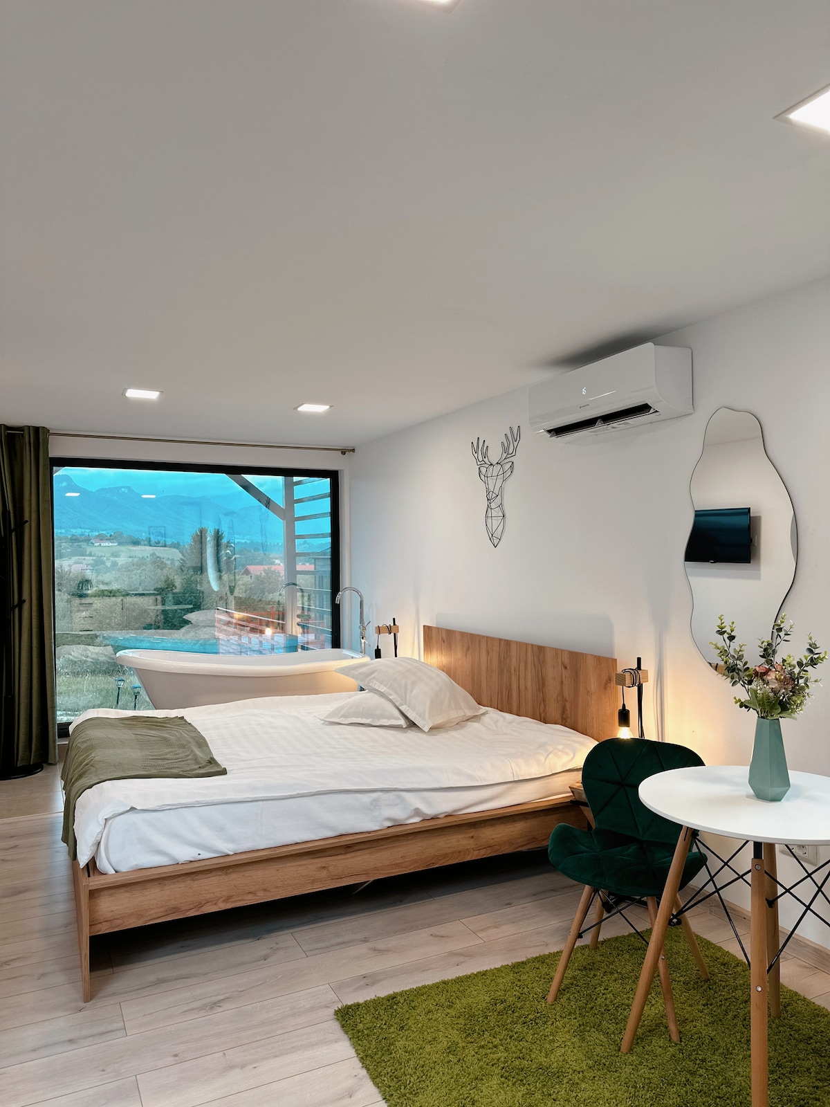 Suite i sléibhte áille na Trasilsláiv, is éard atá inár dteachíní beaga an áit éalaithe fhoirfe i dtearmann te, agus tá tobán te príobháideach ann atá foirfe chun do scíth a ligean tar éis lá fada ag fánaíocht. Cibé acu an bhfuil tú ag lorg eachtraíochta nó saoire shíochánta, cuireann ár 3 chábán theolaí an meascán foirfe de chompord agus den dúlra álainn ar fáil. Faigh blaiseadh den Trasalváin agus tú ar do shuaimhneas.