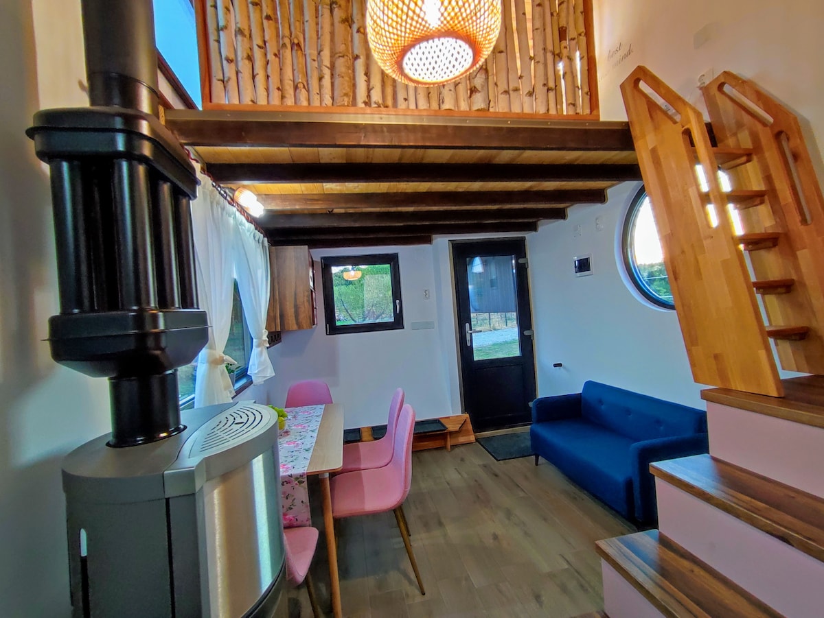 Aimsigh teach beag bídeach uathúil, a cruthaíodh le haghaidh príobháideachta agus scíthe. Déantar an spás a bhainistiú go han - éifeachtach agus cruthaítear an taobh istigh de láimh le hábhair athchúrsáilte. Téitear an teach go huathoibríoch, le millíní adhmaid agus an fíor - lasair. Thuas staighre gheobhaidh tú amach an leithreas agus cábán cithfholcadáin ar leith. Tabhair aird ar na trí chéim ingearacha, d'fhéadfadh sé a bheith deacair do dhaoine a bhfuil a soghluaisteacht laghdaithe! Ná húsáid fearais leictreacha le cumhacht níos mó ná 1000W! Tá an teach do dhaoine fásta amháin.