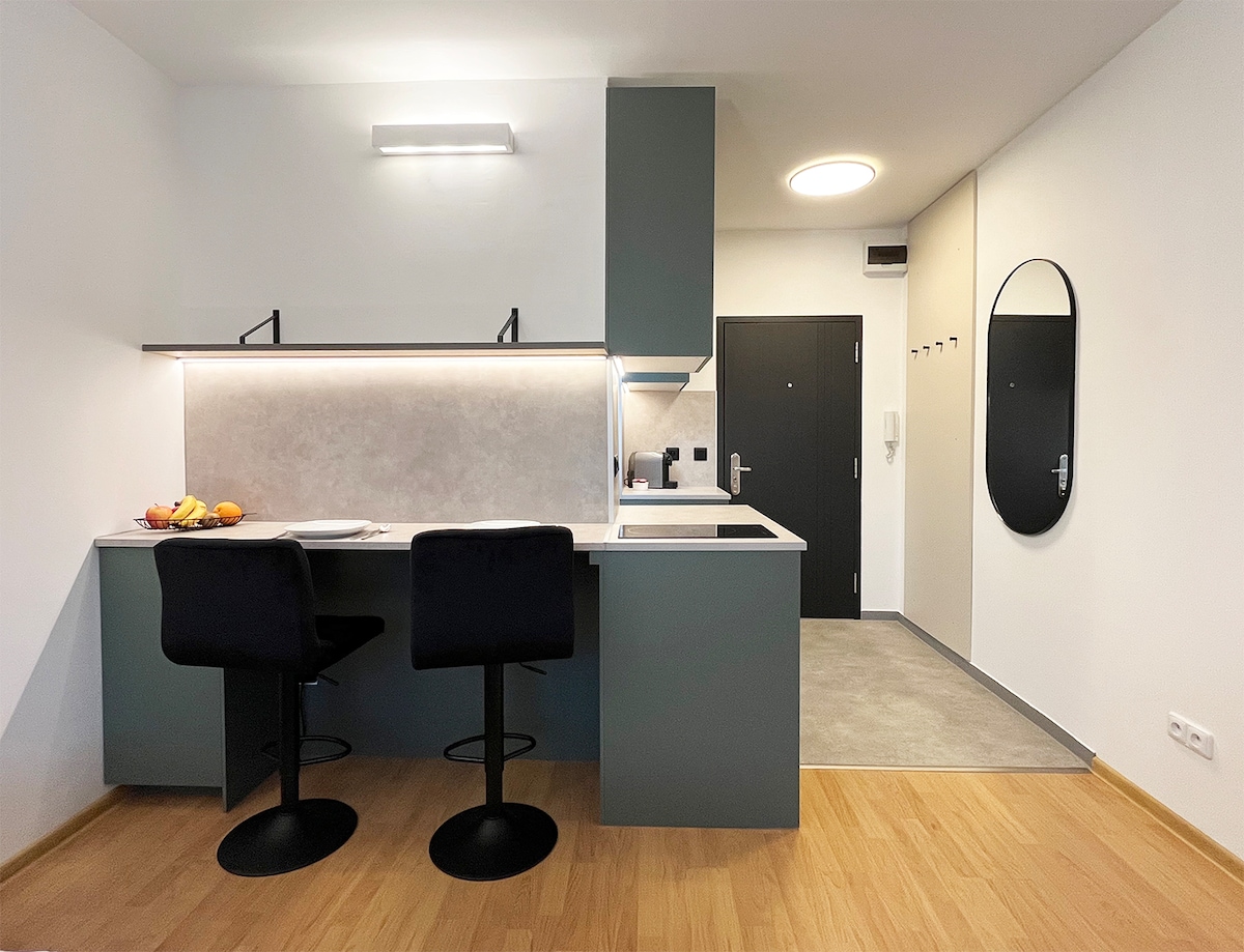 Haigh! Is lánúin óg muid a bhfuil ár n - árasán beag dearthóra á ligean ar cíos againn, agus ba bhreá linn tú a óstáil. Is spás nua - aimseartha teolaí é ina bhfuil gach rud a theastaíonn uait le haghaidh fanacht compordach, ach is é an fíorsheoid ár n - ardán mór. Taobh istigh, gheobhaidh tú cistin lánfheistithe, seomra folctha galánta, agus áit chodlata chompordach. Tá an t - árasán i gcomharsanacht chiúin, gar do shiopaí, do bhialanna agus d'iompar poiblí, mar sin tá sé an - éasca dul timpeall.