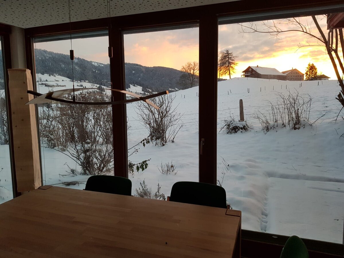 Sealla adhmaid nua - aimseartha le radharc iontach ar an ngleann ar fad agus isteach sna hAlpa iontach austrian. 3 urlár le charme supercomfy, atá suite os cionn Schwarzenberg agus tiomáint 5 nóiméad chuig an ionad sciála Bödele. Tá an teach suite thart ar 15 / 20 nóiméad i gcarr ó chuid de na hionaid sciála is fearr sna ceantair mar Mellau/Damüls, thart ar 35 / 40 nóiméad go dtí an ceann scríbe sciála is fearr agus is mó san Ostair, an Arlberg, atá ceangailte trí Schröcken/Warth trí nasc díreach le carr cábla.