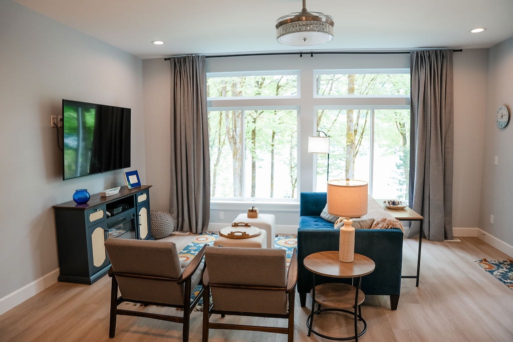 Éalaigh go dtí an teachín teolaí i bhforaois na gcrann mór. Tógtha go héiceolaíoch, timpeallacht shláintiúil ina bhfuil gach rud a theastaíonn uait le haghaidh fanacht compordach. Cuireann fuinneoga móra pictiúr ar do shuaimhneas thú go bhfuil tú mar chuid den fhoraois. Bain sult as cuairt a thabhairt ar bhaile Poulsbo na hIorua, ach níl Seattle i bhfad ar shiúl. Tá go leor conairí, páirceanna agus tránna fánaíochta agus gléasta in aice láimhe freisin, agus níl i bhForaois Náisiúnta na gCluichí Oilimpeacha ach caitheamh amach. Faigh blaiseadh de dhraíocht na gcrann mór!