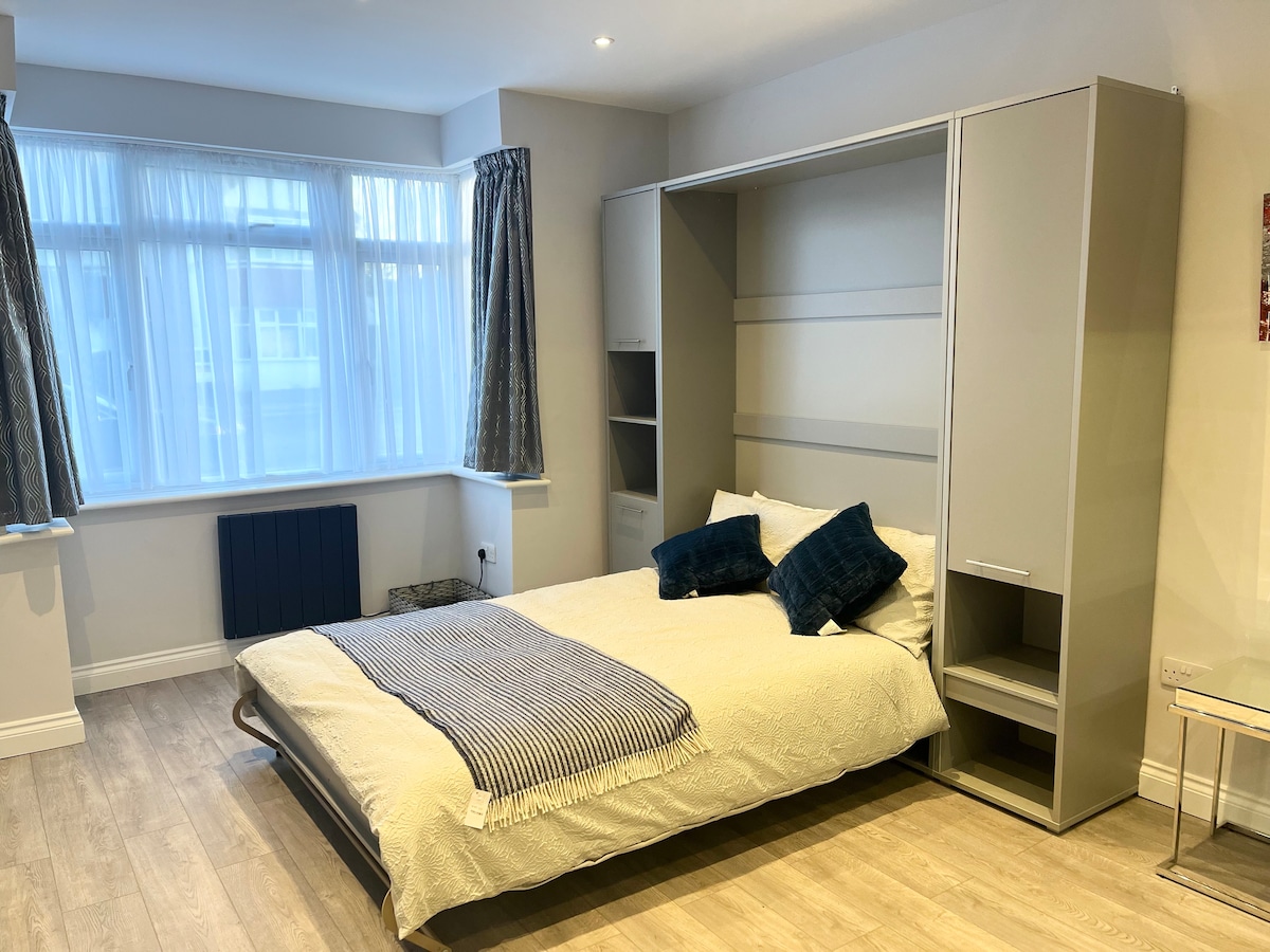 Árasán Stiúideo Nua Stylish agus Brand Bíodh compord agus stíl agat san árasán stiúideo seo ar urlár na talún ina bhfuil bealach isteach príobháideach. Bain sult as cistin iomlán, seomra cithfholcadáin álainn, agus leaba bhalla ar mhéid rí a chuireann spás breise ar fáil. Lonnaithe ar shráid chiúin in Golders Green, Mórcheantar Londan, níl tú ach siúlóid 4 nóiméad go dtí an t - ionad siopadóireachta, bialanna agus páirceanna Brent Cross. Foirfe do thurasóirí nó do lánúineacha atá ag lorg éalaithe teolaí. Déan áirithint anois do d'eachtra i Londain!