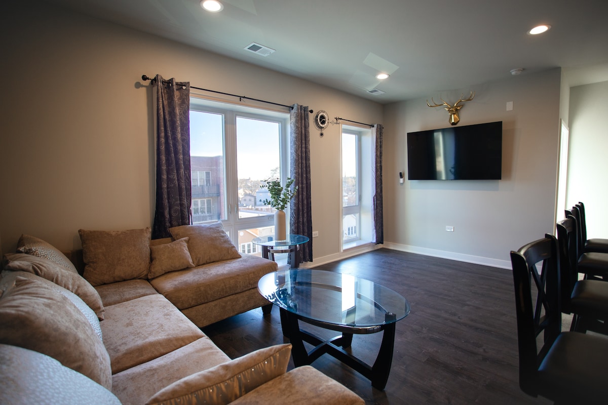Bí teolaí san árasán fairsing 3 sheomra leapa seo, atá suite go háisiúil 3 bhloc ón Líne Oráiste Halsted ag breathnú amach ar Pháirc Palmisano agus gan ach 5 nóiméad sa charr go dtí Plás Mhic Chormaic. Glan, néata, nua - aimseartha agus compordach, cuireann an t - árasán spás maireachtála fairsing ar fáil ina bhfuil cistin oscailte, meaisín níocháin/triomadóir, agus balcóin lasmuigh atá foirfe do theaghlaigh agus do ghrúpaí. Ocras? Cuireann ár gcoimpléasc cúpla rogha bhialann yelp ard - rátáil bhlasta ar fáil chun do dhúil a chomhlíonadh. Táimid ag tnúth le tú féin agus d'aíonna a óstáil!