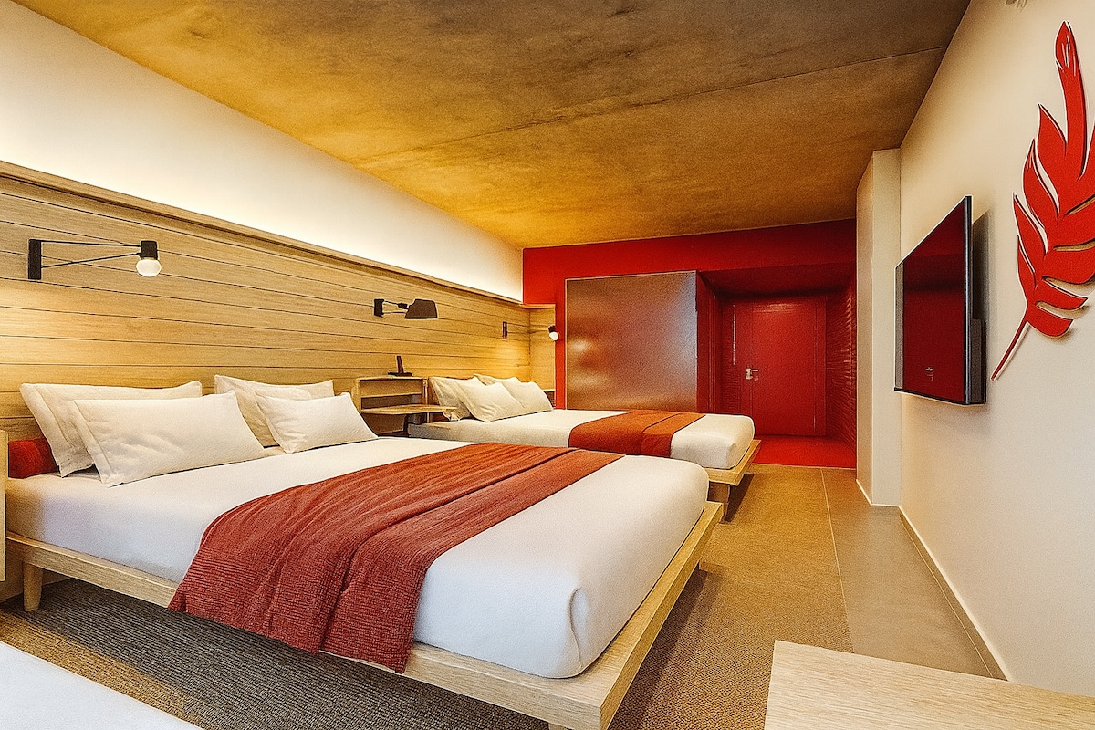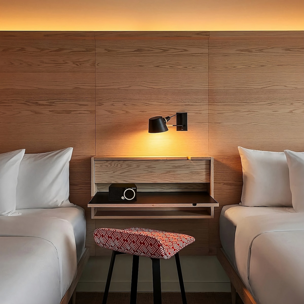 The Superior Queen room features two queen beds in contemporary comfort. Enjoy modern amenities like a desk, microwave, wet bar, mini fridge, high-speed Wi-Fi, and a 43 inch Smart TV, plus plush linens and custom black-out curtains for restful nights. Thoughtful touches like bedside USB charging, individual climate control, and premium bath amenities ensure convenience and relaxation. Settle in and experience a serene retreat in the heart of New York City.