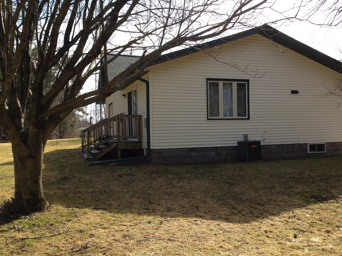 Tá an teach álainn seo, a ndearnadh athchóiriú air le déanaí amach sa tír síos bóthar marbh, ach níl sé ach cúpla míle ó bhaile Ladysmith fós. Tá sé thart ar mhíle ó pháirc bheag chontae ar Taiscumar Dairyland, gan ach cúpla míle ón ngalfchúrsa áitiúil, agus díreach síos an bóthar ó chroitheadh ar an gcosán sneachta sa gheimhreadh. Tá bád ag tuirlingt ag an bpáirc don samhradh agus rochtain ar iascaireacht oighir sa gheimhreadh. Tá súil againn 5*s a thuilleamh agus táimid ag tnúth le tú a óstáil! Ceadúnas Stáit # VJAS-BCCLDB