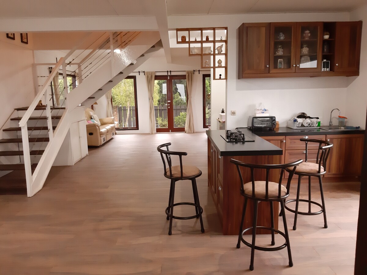 AC nua i ngach seomra. Tá dearadh nua - aimseartha ar an villa seo atá suite in Lembang. 1400 m2 gairdín w/deic ollmhór, poll dóiteáin, & beárbaiciú. Teach fairsing 4 brm/ 3bth le Wi - Fi tapa, Netflix, línéadach caighdeánach óstáin & tuáille, agus cistin lánfheistithe. Cainteoir cáirióice Nóta: - 12 dhuine ar a mhéad. - Seiceáil isteach go luath nó seiceáil amach go déanach IDR 100,000 in aghaidh na huaire bunaithe ar infhaighteacht. - Cosnaíonn logán dóiteáin 100 rb. - Seirbhís Laundy 30 rb/kg