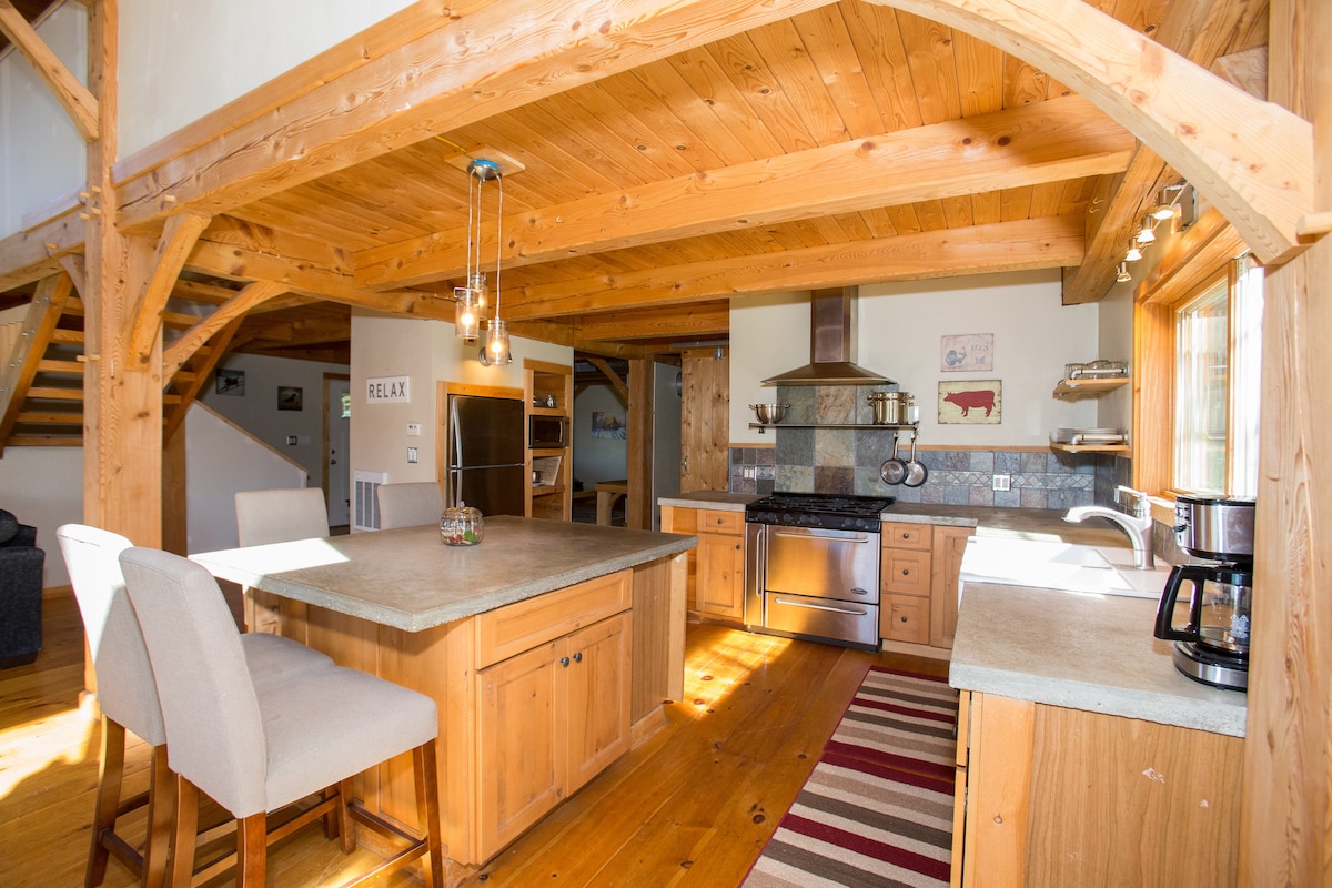 Éalaigh go dtí ár gcábán álainn Vermont, a athraíodh ina thearmann nua - aimseartha, cluthar agus lán gréine. Ón nóiméad a rachaidh tú isteach, beidh tú ar do shuaimhneas sa spás fáilteach seo. Is leatsa an cábán & an clós iomlán le linn d'fhanachta. Coinníonn wifi snáithín ardluais tú ceangailte agus tá fáilte roimh mhadraí. Nílimid ach 15 -20 nóiméad ó Mad River Glen, Mt. Ellen & Sugarbush. Tá go leor bialanna & siopaí laistigh de 15 nóiméad go Waitsfield, 20 nóiméad go Waterbury.