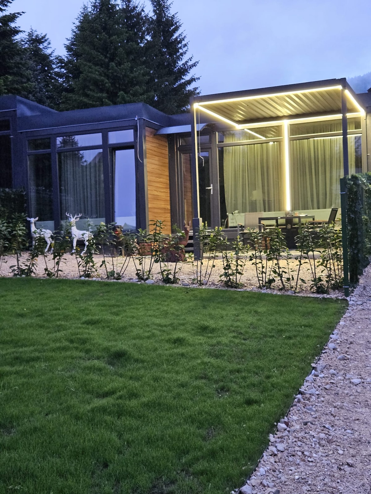 Tairgeann TwinHousesBusteni 2 theach Aframe/ 4 áit , in Busteni ag breathnú amach ar M - tii Bucegi agus ar an gCros ar Caraiman. Tá a bheárbaiciú agus a thobán féin ag gach teach beag bídeach. Is é 300 lei praghas an tobáin agus tógann sé 4 uair an chloig chun é a théamh agus is féidir leat taitneamh a bhaint as thart ar 5.6 uair an chloig, díreach trí choinne roimh ré. Taobh istigh de na tithe níl aon chócaireacht ann,ach taobh amuigh sa gazebo tá sorn agat!