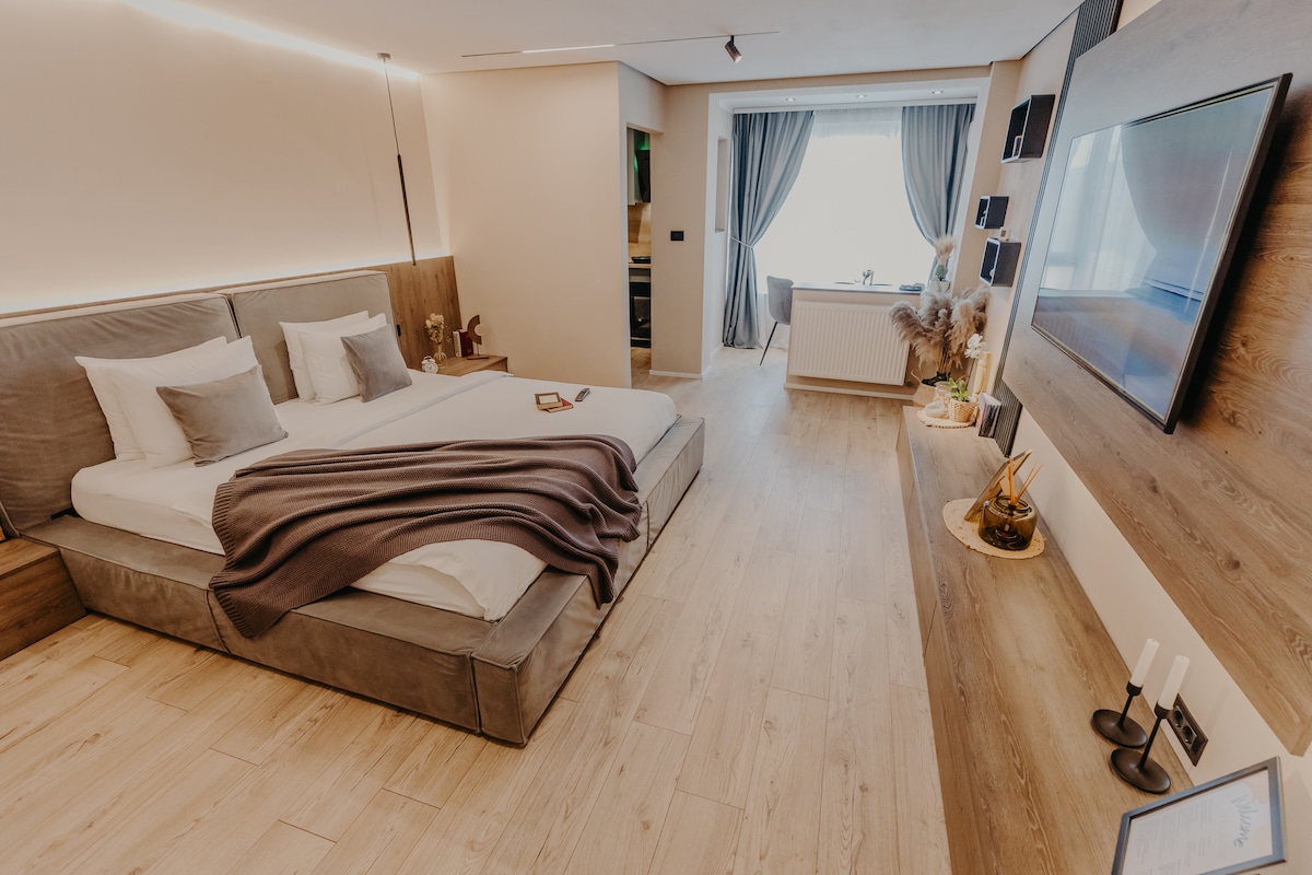 This studio apartment has a total surface of 100 m2, half of them being the big terrace which host the very intimate private jacuzzi. This is the perfect couple spot, because the line of walnuts which is near the terrace offers the exact amount of natural privacy needed to fully enjoy the jacuzzi. The apartment is an open-space studio with a king size bed, a couch, a dining area and a kitchenette. Smoking is not allowed inside, is allowed only on terrace.
