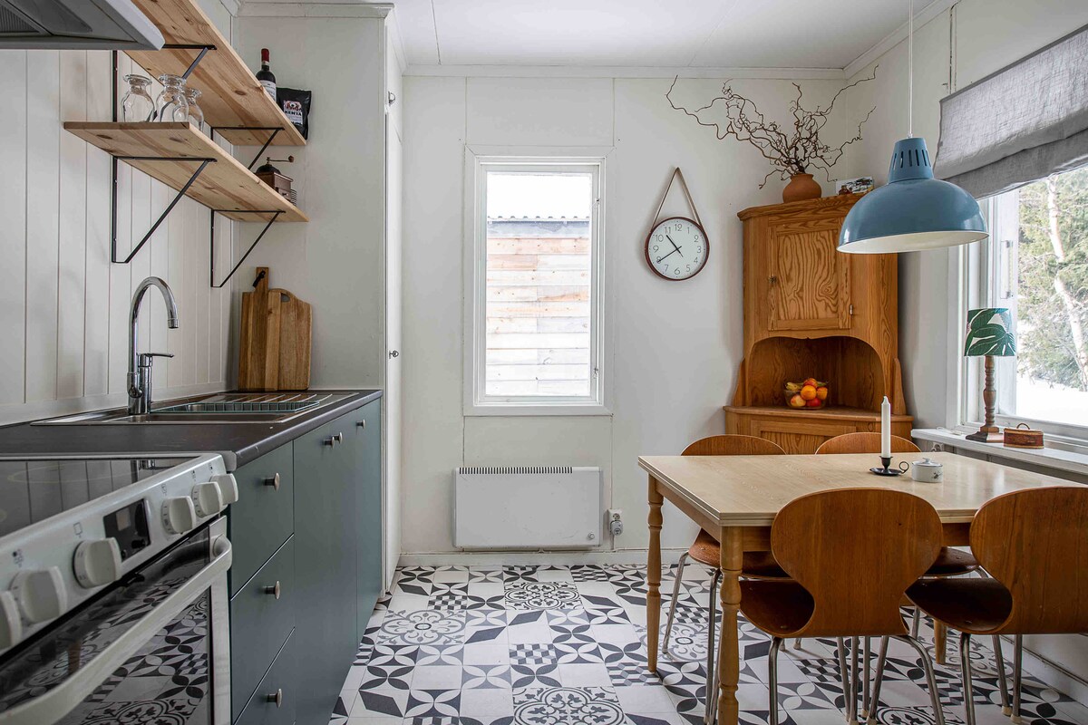 Scaoil isteach sa spás uathúil suaimhneach seo. Bog isteach sa seanchaifitéire scoile ina raibh a lón scoile ag daltaí na heaglaise i rith an lae sna 40idí agus sna 50idí. Is é an sorn adhmaid a chnagann sa chistin an ceann céanna ar ar chócaráil an mháthair lón. Bhí cónaí uirthi thuas staighre agus cuirimid a cistin ar fáil le seomra leapa agus seomra folctha in aice láimhe. Ciúin agus síochánta sa seanfhoirgneamh adhmaid. Lasmuigh, is féidir leat taitneamh a bhaint as radhairc sléibhe nó cuairt a thabhairt ar eaglais álainn Frösön, atá in aice leis an mbiocáire ina gcónaíonn an lánúin óstach lena madraí agus lena gcat.