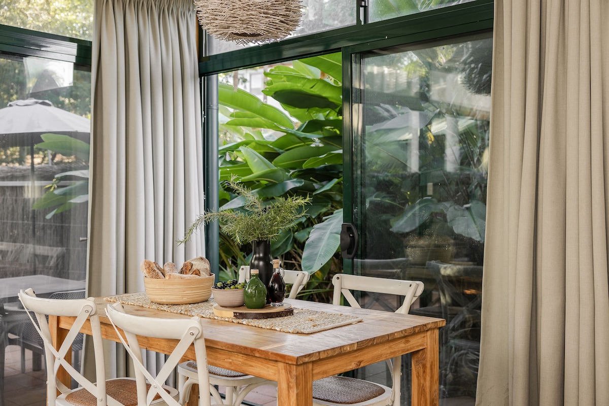 Teachín fairsing álainn nua - aimseartha atá suite i 5 acra de ghairdíní luibheolaíocha trópaiceacha coimhthíocha le pócaí foraoise báistí agus cuasa, áit ar féidir leat dearmad a dhéanamh ort féin agus díreach a bheith ann. Spás príobháideach iontach, fálaithe go hiomlán do suas le 4 dhuine chun a scíth a ligean agus taitneamh a bhaint as suaimhneas an Ghairdín uisce Bali máguaird agus do linn snámha tumtha príobháideach féin agus tobán te 5 dhuine i ngazebo álainn. Spás síochánta, ach gan ach 15 nóiméad go extraordumbimby, Brunswick Heads agus tránna aigéin