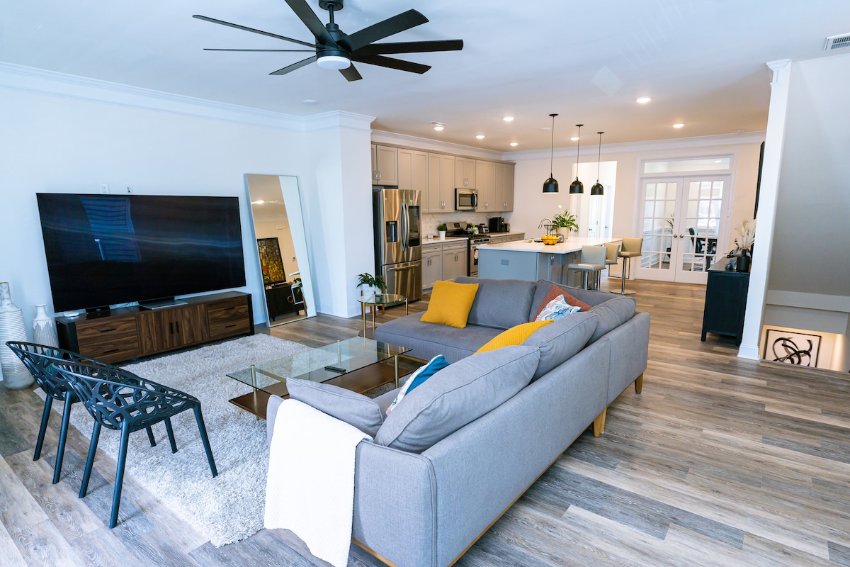Newly built mid-century modern corner townhouse in Charlotte’s University area! 3 spacious bedrooms (King, Queen, Full + Twin) each with en-suite bath, plus a half bath and 1 extra twin floor mattress. Game room with hockey table, arcade, axe throw & jumbo Connect 4. TVs & fans in every room, modern washer/dryer, fully stocked essentials. Walk to Target, Starbucks & restaurants. 15 mins to Uptown, 20 mins to airport. Perfect mix of luxury, comfort & fun!