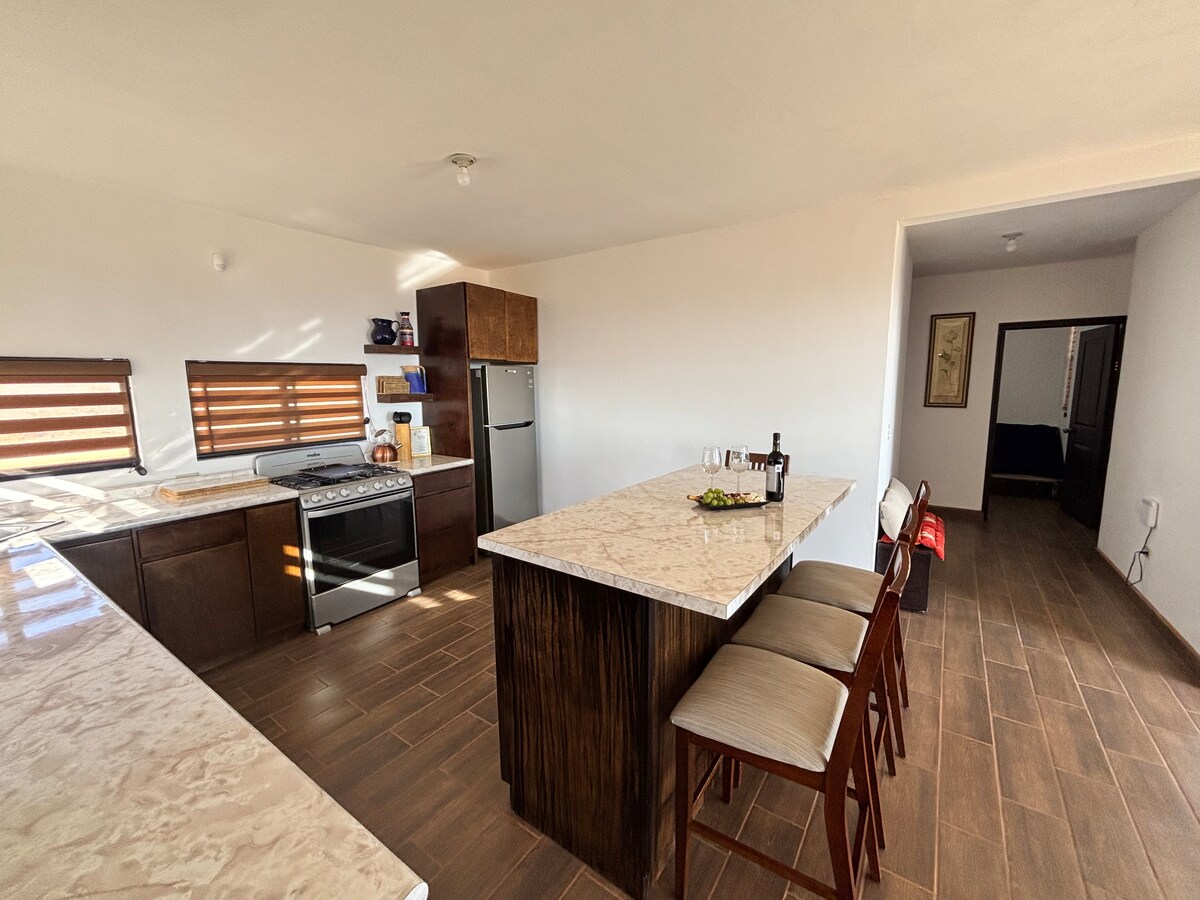 Bain sult as blaiseadh cósta ag ár dtearmann 1BR, 2BA cois trá in Ensenada, ag meascadh dufair agus snáithíní aigéin gan stró. Bíodh compord agat i ngach cúinne le radhairc lánléargais ar an trá agus ar an gcuan. Bain sult as fairsingeacht le seomra leapa mór amháin, dhá sheomra folctha iomlána, dhá sheomra suí fáilteacha, agus dhá phaitió ghalánta. Codlaíonn sé/sí 8, rud a chinntíonn tearmann aoibhinn do chách. Tá do shaoire fhoirfe cois cósta ag fanacht leat!