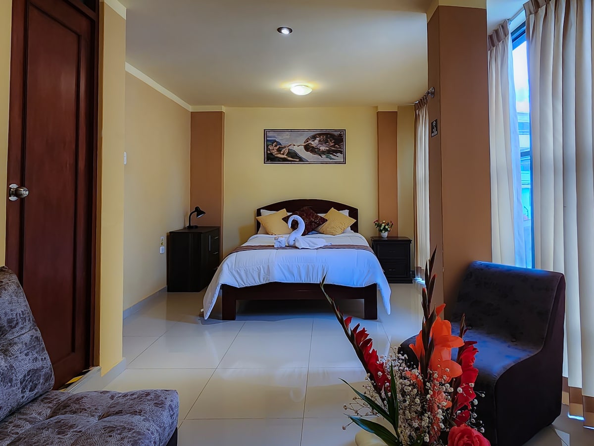 Fáilte go dtí ár seomra compordach teolaí i gcroílár lár Cajamarca! Lonnaithe ach 3 bhloc ón Plaza de Armas stairiúil, beidh tú taitneamh a bhaint as an gcompord agus an suaimhneas a thairgeann an spás seo, le rochtain éasca ar na príomh - nithe is díol spéise do thurasóirí, bialanna agus siopaí áitiúla. Tá an seomra deartha chun atmaisféar suaimhneach a chur ar fáil duit le leaba chompordach, seomra folctha príobháideach, agus maisiúchán simplí ach nua - aimseartha.