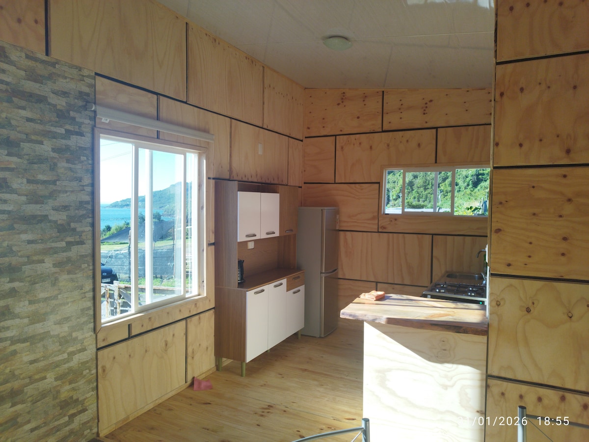 Cábán teaghlaigh an - chluthar os comhair Inbhear Reloncavi, agus spásanna glasa ar fáil d'aíonna, áit an - chiúin le scíth a ligean. I measc na leapacha go léir tá línéadach tí, leaba sillín ar fáil. Cistin fheistithe, cumascóir, cuisneoir, cuisneoir, sorn gáis, oigheann leictreach, oigheann leictreach, tóstaer aráin. Tá sorn millíní, uisce te, Wi - Fi sa chábán. Fáiltiú ag na húinéirí. Tá an tseiceáil isteach ag an gcábán ó 3:00 pm agus seiceáil amach ag 11:00 .”