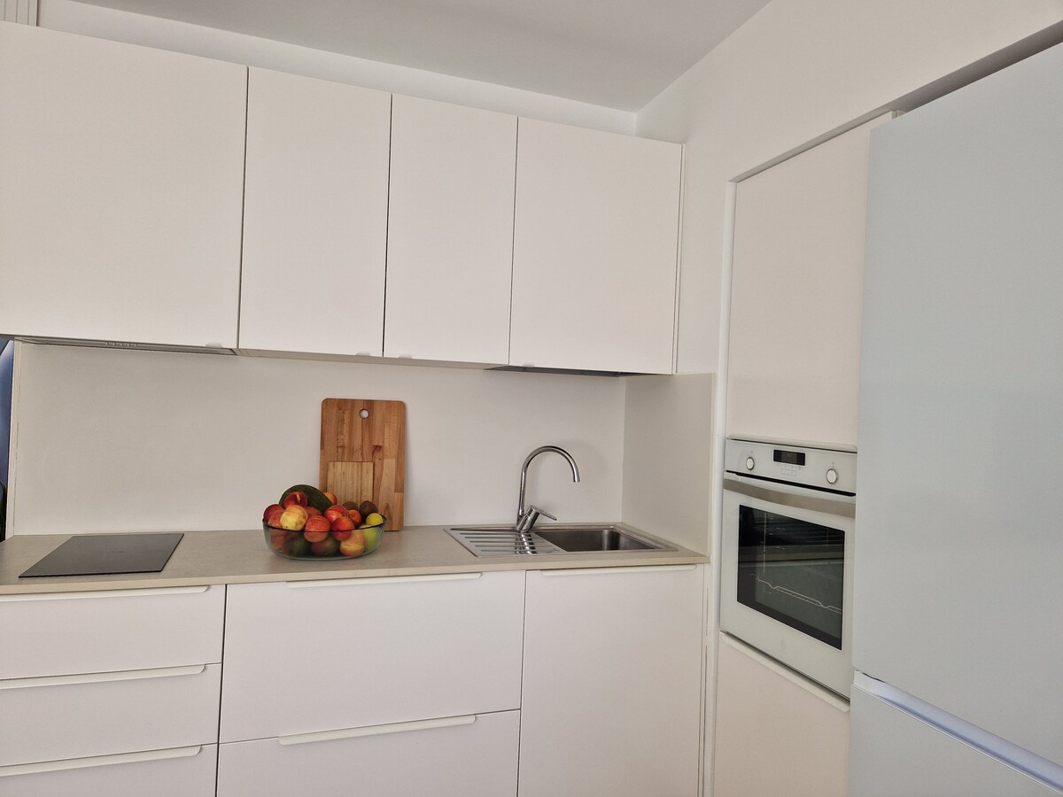 Tá an t - árasán geal teolaí, le spás compordach ina bhfuil seomra leapa, seomra suí, cistin fheistithe agus seomra folctha ar leith. Tá ardán 70 méadar ar an urlár uachtarach ann freisin le roinnt le comharsana, atá oiriúnach chun taitneamh a bhaint as an ngrian, chun ithe amuigh faoin aer, chun ióga a dhéanamh nó chun do scíth a ligean le radhairc lánléargais ar an aigéan. Is é an buaicphointe ná a radhairc farraige ón taobh istigh den árasán agus ón mbalcóin.