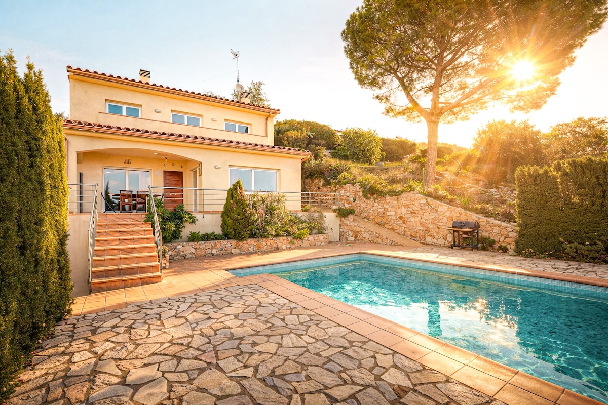 Fáilte go Villa MARIA, Teach álainn athchóirithe le radhairc iontacha ar an Meánmhuir agus ar na sléibhte. Tá 3 sheomra leapa, 3 sheomra folctha, cistin, linn snámha, locháin agus cistin oscailte taobh amuigh in aice leis an linn snámha sa Villa. Tá an Villa suite níos lú ná 10 nóiméad sa charr ón trá agus 10 nóiméad sa charr ó na siopaí agus an siamsaíocht is fearr in Calonge agus Platja d'Aro.
