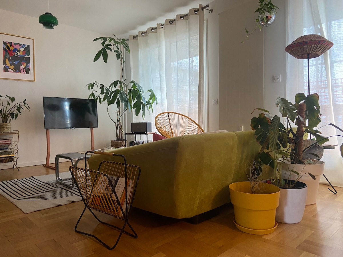 Lig do scíth sa spás ciúin galánta seo. Cistin lánfheistithe agus feidhmiúil (oigheann, miasniteoir, meaisín caife nespresso, cuisneoir/reoiteoir, srl.), leaba chrochta ardchaighdeáin (160cm x 200cm) agus comhlaí leictreacha d'oícheanta aisiríocha, seomra folctha le meaisín níocháin, neart stórála. Balcóin le radharc agus gan dearmad déanta air, páirceáil saor in aisce ag bun an fhoirgnimh. Tuigfidh tú, gheobhaidh tú na bunriachtanais go léir le haghaidh fanacht taitneamhach in Lyon.