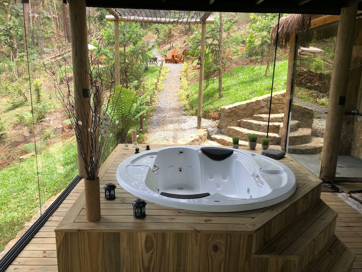 Faigh amach faoi gheasa Serra da Mantiqueira sa chábán seo atá deartha ionas gur féidir leat machnamh a dhéanamh ar éirí na gréine gan éirí as an leaba. Tar ar do shuaimhneas inár spá téite, ag stánadh ar an líonra lastuas agus luascadh. Tá seomra comhtháite sa chabana ina bhfuil leaba chluthar na Banríona. Sa bheo/sa chistin, freastalaíonn futon an - chompordach ar bheirt aíonna eile, rud a fhágann go bhfuil an t - eispéireas oiriúnach do theaghlaigh. Tá cosáin agus easanna beaga sa réadmhaoin freisin.