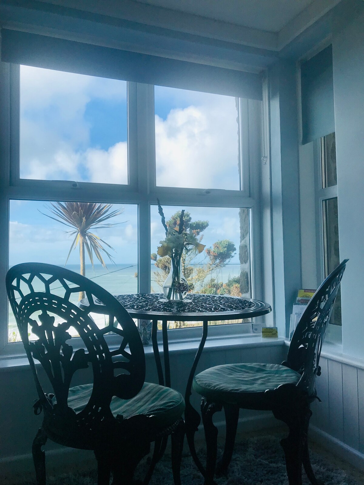 Radharc iontach ar an aigéan 200 clós ón aill agus ó shiúlóidí trá. Seomra nua - athchóirithe, sómasach, glan, ensuite le teilifís, agus áit suí. Iarscríbhinn phríobháideach leis an bpríomhtheach lena bhealach isteach ar leith féin. Is féidir é a chumrú mar LEABA RÍ - NÓ ROINNTE mar 2 SHINGIL MÁ IARRTAR. Roghnaigh rogha 2 aoi mura bhfuil tú ag taisteal aonair. Wi - Fi. Teach veigeánach, éiceabhách glanta. Rogha gránaigh bhricfeasta, tae, caife & bainne bunaithe ar phlandaí - cuisneoir beag agus saoráid déanta dí. Micreathonnán. Páirceáil saor in aisce.