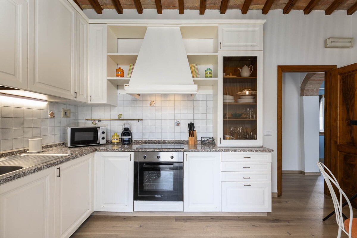 Árasán cluthar do 4 dhuine atá feistithe i stíl na Tuscáine agus bíomaí nochta ann, suite i measc chnoic dhroimneacha thírdhreach na Tuscáine. Tá rochtain ag aíonna ar ghairdín faoi throscán, ar Wi-Fi saor in aisce, ar linn snámha chomhroinnte, ar oigheann dóite adhmaid, ar bheárbaiciú agus ar mheaisín níocháin. Athchóiríodh an t-árasán ó theach feirme gleoite cloiche ón 19ú haois, a ndearnadh athchóiriú air le déanaí i dtráidisiún na Tuscáine agus a roinneadh ina thrí árasán chompordacha.