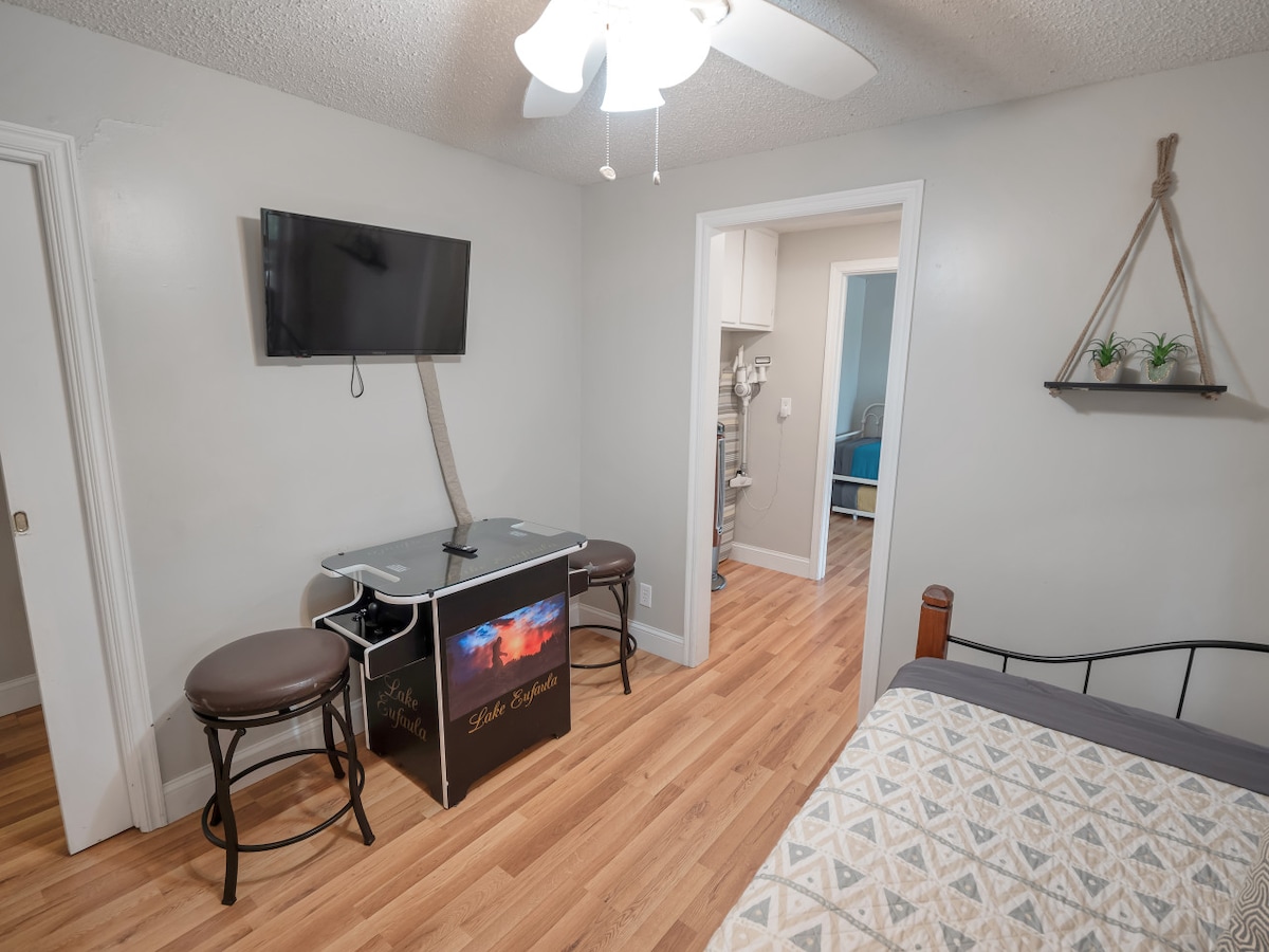 Beidh do ghrúpa iomlán compordach sa spás fairsing uathúil seo. Radharcanna cois locha ón seomra suí agus ón bpaitió. Go leor cluichí, leabhair, agus puzail le himirt ar an mbord poker/cluiche agus tábla linn snámha. Téigh ag siúl thar ár ndroichead adhmaid go dtí an duga príobháideach clúdaithe chun iascaireacht a dhéanamh, na cadhcanna a thógáil amach, nó suí agus scíth a ligean. Tar éis lá iomlán spraoi, suigh siar agus lig do scíth in aice le tine le roinnt s'mores. Díreach nóiméad ar shiúl ó bhialanna iontacha in Eufaula agus in Arrowhead Park.