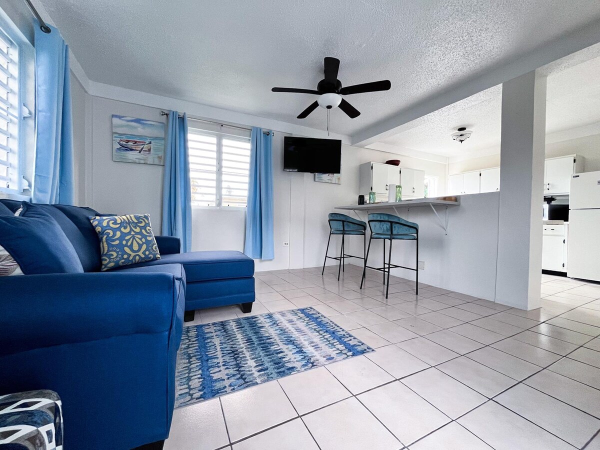 🌊 Faigh blaiseadh den éalú cois farraige is fearr ag Ocean Breeze – árasán iontach cois farraige ina bhfuil radhairc iontacha! 🌅 Níl san aonad cúinne 1 Seomra Leapa (leaba Rí 🛏️ )/ 1 seomra folctha ar bharr an urláir ach siúlóid ghearr (0.3 míle👣) ó Thrá Chuan na gCána, ceann de na háiteanna is fearr sa Mhuir Chairib le haghaidh snámha, snorclála agus tumadóireachta 🤿. Bain sult as an linn snámha sáile pobail🏖️, do bhalcóin phríobháideach féin🌴, agus rochtain éasca ar bhialanna éagsúla in aice láimhe🍽️.