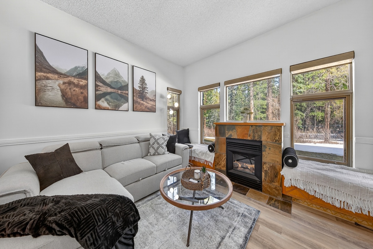 RADHAIRC LÁNLÉARGAIS AR SHLÉIBHTE, 2 THOBÁN TE LASMUIGH, SABHNA AGUS PÁIRC AN NÁISIÚIN SAN ÁIREAMH Lig do scíth ar an bpaitió agus bí ar do shuaimhneas sna radhairc is iontaí in Canmore! Tá na Triúr Deirféar, Mount Rundle, agus Ha - Ling Peak díreach taobh amuigh de do dhoras. Go deimhin, tá radharc iontach ar chárta poist ag gach fuinneog! Tá gach rud a theastaíonn uait chun cuairt gan dua a thabhairt ar na Sléibhte Creagacha; Cibé an bhfuil tú ar saoire le do theaghlach, ar shaoire rómánsúil, nó ag obair go cianda!