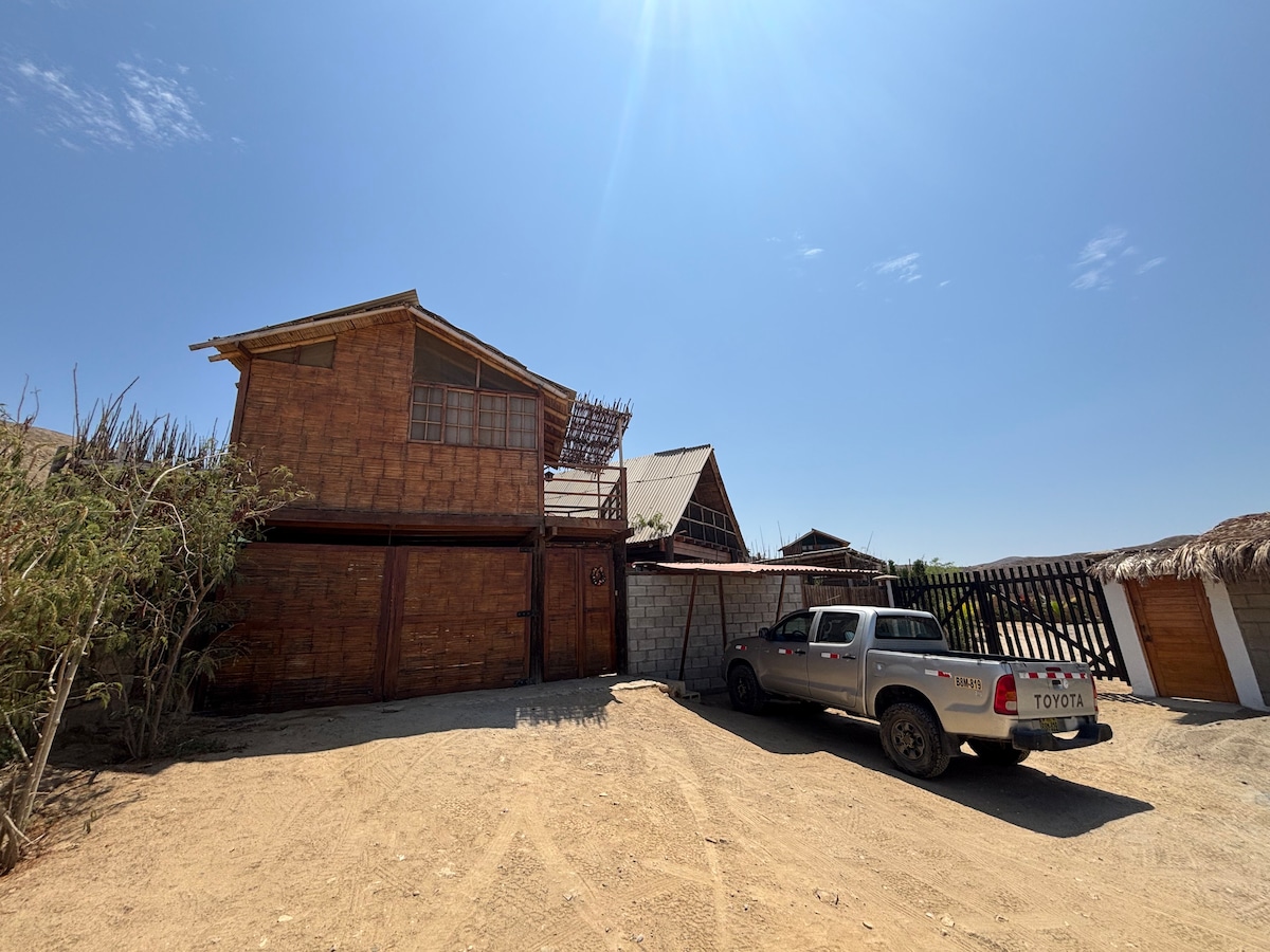 Tiontaithe ag 1 teach trá 45 méadar ón bhfarraige. Tá an plota fálaithe agus sa tsraith tosaigh. Ó 1 go 11 duine (4 sheomra) a tógadh le hábhair ó thuaidh Peruvian, bambú agus pailm ar leibhéal talún amháin 1600 m2 i mbloc árasán príobháideach. Lig do scíth le fuaim na farraige agus bain sult as an gcladach cúpla méadar ó do leaba. An - tuathúil, nádúrtha, compordach, simplí, glan agus príobháideach Braithfidh líon na seomraí leapa atá ar fáil le haghaidh d'úsáide ar líon na n - aíonna a cuireadh in áirithe le haghaidh d'úsáide.