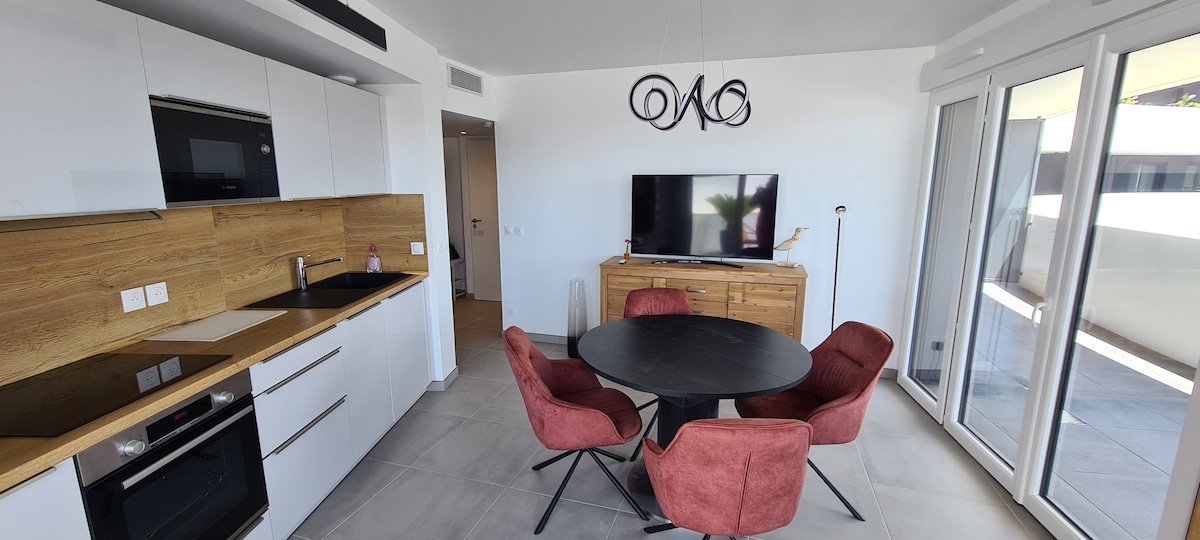 Árasán 5 dhuine (codladh ar leith do pháistí) In aice le gach saoráid, tá gach rud de shiúl na gcos: Tránna (conch, plagette, caoch) Port an ionaid rochtana (siopaí, siamsaíocht, bialann) Aerchóiriú - Idirlíon - Wi - Fi (bosca) - Páirceáil shlán Linn snámha le cathaoireacha suaimhnis (dhá linn snámha - ceann do na cinn bheaga) Tá an t - árasán feistithe go hiomlán (reoiteoir mór cuisneora, miasniteoir, meaisín níocháin, teilifís ceangailte, tolg. Ardán oscailte ag breathnú amach ar na báid (scáth fearthainne, bord lasmuigh agus cathaoireacha)
