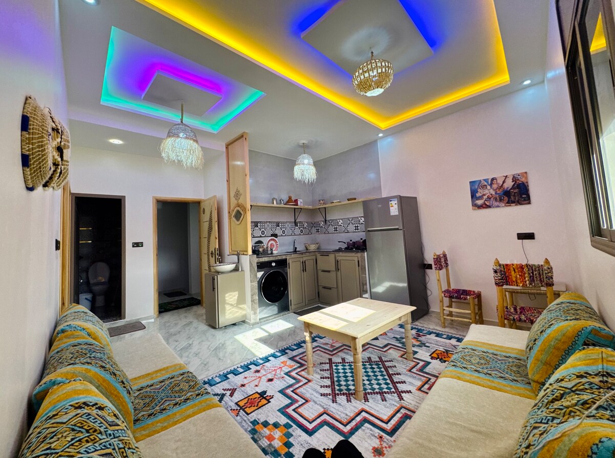 🌊 DAR MOGADOR OCEAN – Éalú galánta idir traidisiúin aigéin, sléibhe agus Berber I sráidbhaile ildaite Aghroud, bríomhar sa samhradh, tá an riad gleoite seo os comhair an Atlantaigh agus tá radhairc iontacha ar fáil ar an trá agus ar an aigéan. Bíonn gach éirí agus luí na gréine ina nóiméad draíochtúil. 30 km ó Agadir agus 10 nóiméad ó áiteanna surfála Taghazout, comhcheanglaíonn sé barántúlacht Mharacó, compord nua - aimseartha agus atmaisféar suaimhneach. Tá 🚗 rochtain ar charr riachtanach. Páirceáil saor in aisce os comhair an tí.