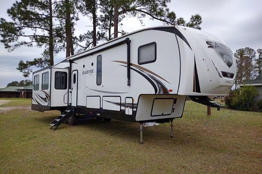 Near Fort Liberty, Fayetteville Airport, and Cape Faer Valley Hospital. Discount for Travel Nurses and Military. 2020 Jayco Eagle 357MDOK Fifth wheel perfect for living in while building a house, PCS’ing, or working on the road. This trailer has it all. Wired with solar for living off grid while enjoying all the comforts of home. 42 feet long with 4 slides, there’s room for the whole family. Sleeps eight comfortably; (4) beds This is COUNTRY LIVING! Country sounds and country critters.