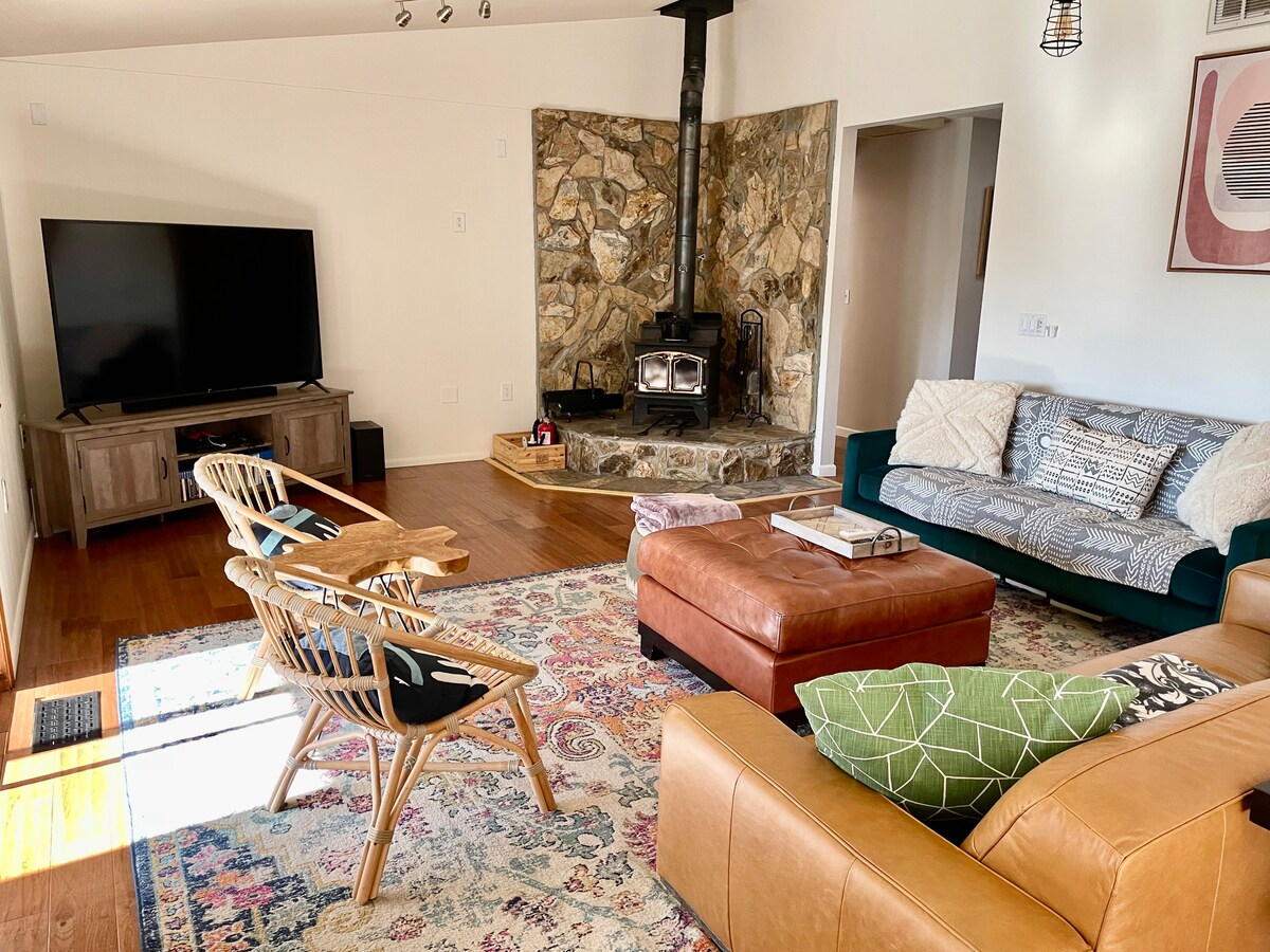 Déan dearmad ar do bhuairt sa teach fairsing suaimhneach seo. Nuashonraíodh le déanaí 1200 troigh chearnach 2 sheomra leapa, 2 theach seomra folctha atá neadaithe i measc bioráin mhóra, cedair agus dairí. Lonnaithe i gcomharsanacht gheataithe idir dhá bhaile rabharta óir gleoite ina bhfuil siopadóireacht, blaiseadh fíona, cosáin fánaíochta agus radharc na súl. Is féidir teacht ar áiteanna sciála go héasca le haghaidh turais lae. Lig do scíth nó dine ar an deic le gloine fíona áitiúil agus féach ar na fianna cairdiúla ag spaisteoireacht thart uaireanta ag stopadh le heileo a rá.