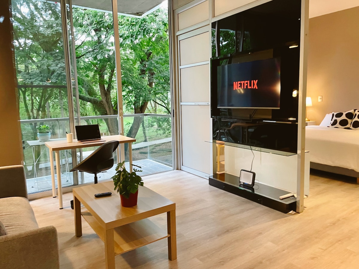Éalaigh go dtí compord agus suaimhneas áit eisiach sa chathair! An bhfuil fanacht compordach suaimhneach á lorg agat? Cuireann an apartaestudio nua - aimseartha seo gach rud atá uait ar fáil, tá sé suite in earnáil eisiach shábháilte den chathair, le rochtain dhlúth ar an dúlra agus 5 nóiméad ó ionaid siopadóireachta. Beidh an chothromaíocht fhoirfe agat idir an tsíocháin agus an compord. Tá leaba dhúbailte ann, leaba leathdhúbailte inbhainte agus rogha chun mata breise a tharraingt amach, foirfe do lánúineacha nó do theaghlaigh bheaga.