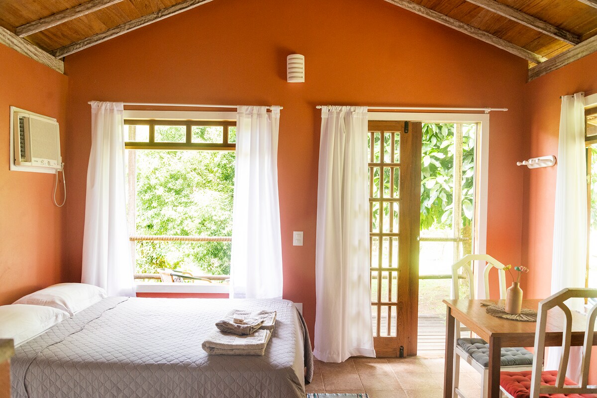 Táimid lonnaithe in Sana RJ i suíomh mór agus faoi phribhléid. Féachaimid le cuimhní cinn agus cuimhní cinn iontacha a chur ar fáil dár n - aíonna maidir le go leor suaimhnis, sosa agus teagmhála leis an dúlra. Tá dhá dheic taobh amuigh, ceann acu le radharc lánléargais agus príobháideach agus an dara ceann ag an abhainn. Ideal le haghaidh machnaimh, cleachtais ióga agus ar ndóigh, cluichí le leanaí. Le haghaidh cruthaitheoirí ábhair, spás foirfe do ghrianghraif agus físeáin iontacha! Lean @aconchegonosana