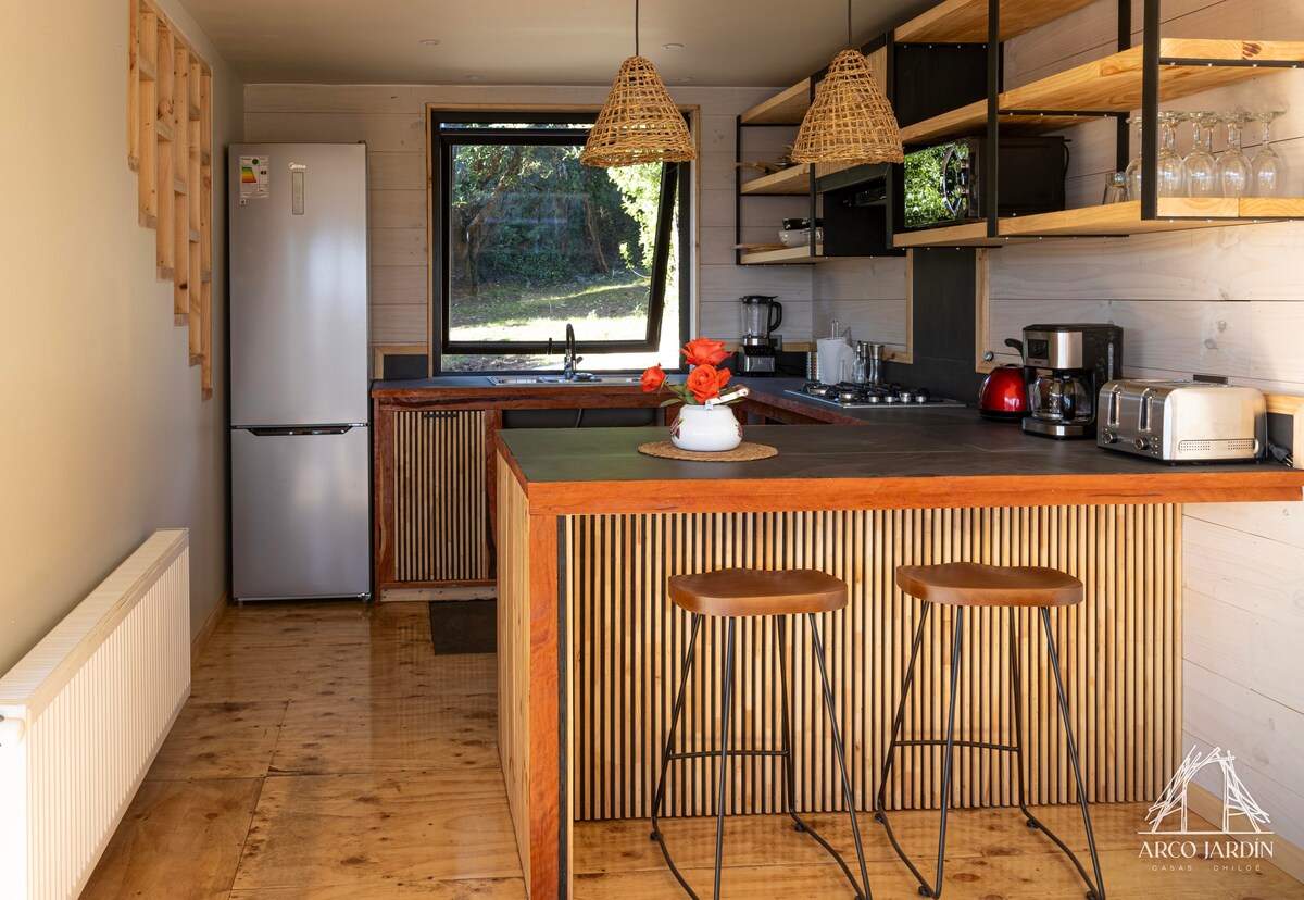 Cábán álainn i lár na tuaithe Chiloé. Tá an cábán suite go sonrach in Teguel Bajo, pobal beag 4.5 km ó bhaile Dalcahue. Is áit í i lár na tuaithe, timpeallaithe ag foraoisí dúchasacha, cúpla méadar ó Bhogach Teguel agus le radharc álainn ar Chanáil Dalcahue. Ar an gcéad urlár tá go leor spáis ina bhfuil an chistin, an seomra suí, an seomra bia agus an feadán te. Sa mezzanine tá an príomhsheomra ina bhfuil leaba 2 sheomra.