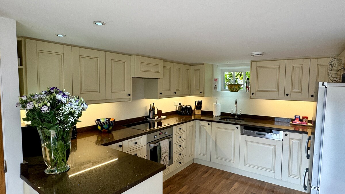 Athchóiriú álainn ar Scioból ón 17ú haois. Athchóirithe le gach aird ar mhionsonraí, flúirse carachtar & bíomaí nochta, cistin lánfheistithe, seomra folctha tarraingteach le folcadán ar bharr rolla & cithfholcadán báistí. Téamh faoin urlár, Wi-Fi Ardluais, Teilifíseán Cliste agus tobán te roghnach (fiosraigh agus déan áirithint roimh ré, le do thoil). Ní thógann sé ach 30 nóiméad ó Aerfort/Stáisiún Gatwick & an Express isteach i Londain, ach tá an Scioból suite faoin tuath, timpeallaithe ag páirceanna, ar réadmhaoin Eachaíochta