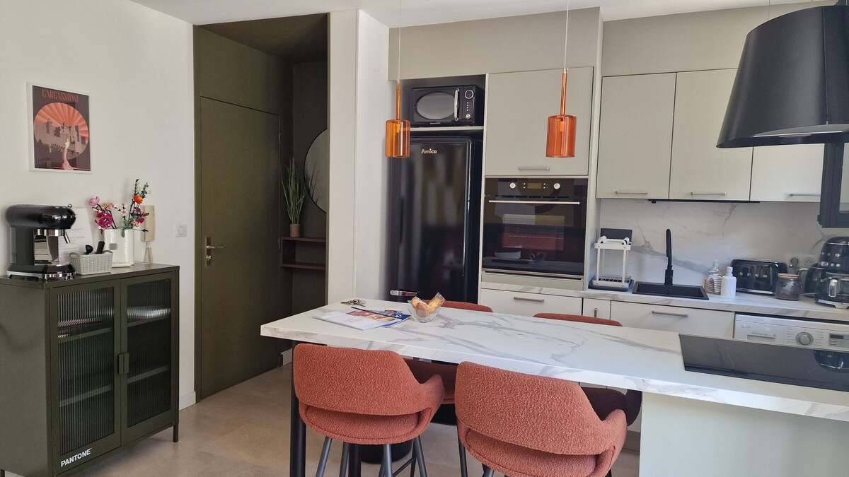 Beidh áthas orainn fáilte a chur romhat chuig an áit uathúil shuaimhneach seo, atá suite ag bun na rampairí, gar do lár na cathrach agus rochtain ar gach saoráid, i gcroílár an cheantair turasóireachta. Gach saoráid a athchóiríodh le déanaí agus atá feistithe le gach saoráid, chomh maith le tobán te, is féidir leat taitneamh a bhaint as fíor - scíth a ligean le radhairc iontacha ar chathair mheánaoiseach Carcassonne. Is é 4 duine an acmhainn. Is féidir áirithint a dhéanamh ó bheirt.