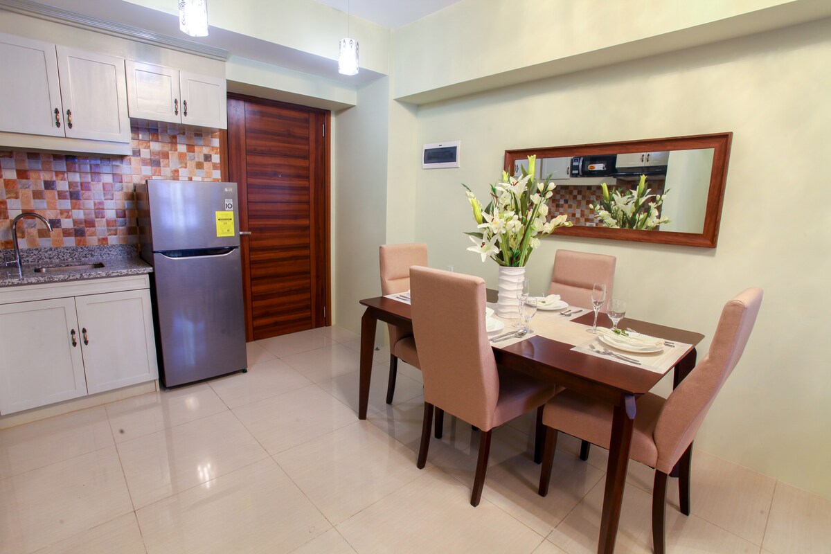 Aonad 1 BR lán - troscáin in Avida Condominium Tower 2. Cuimsíonn troscán leaba de mhéid na Banríona, tolg 3 shuíochán ar chruth L le leaba tarraingthe amach, tábla itheacháin 4 shuíochán, 40” teilifíseán CLISTE ar scáileán cothrom le Netflix HD, 4 oigheann ar bharr sorn, cuisneoir, micreathonnán agus meaisín níocháin i seomra níocháin ar leith. Idirlíon Snáithín ardluais de 100Mbps atá oiriúnach le sruthú ar Theilifís Chliste agus ar ríomhaire glúine/úsáid mhóibíleach. Tá sé suite laistigh de Pháirc IT agus tá an foirgneamh os comhair Sugbo Mercado (margadh bia deireadh seachtaine) agus Ayala Mall.