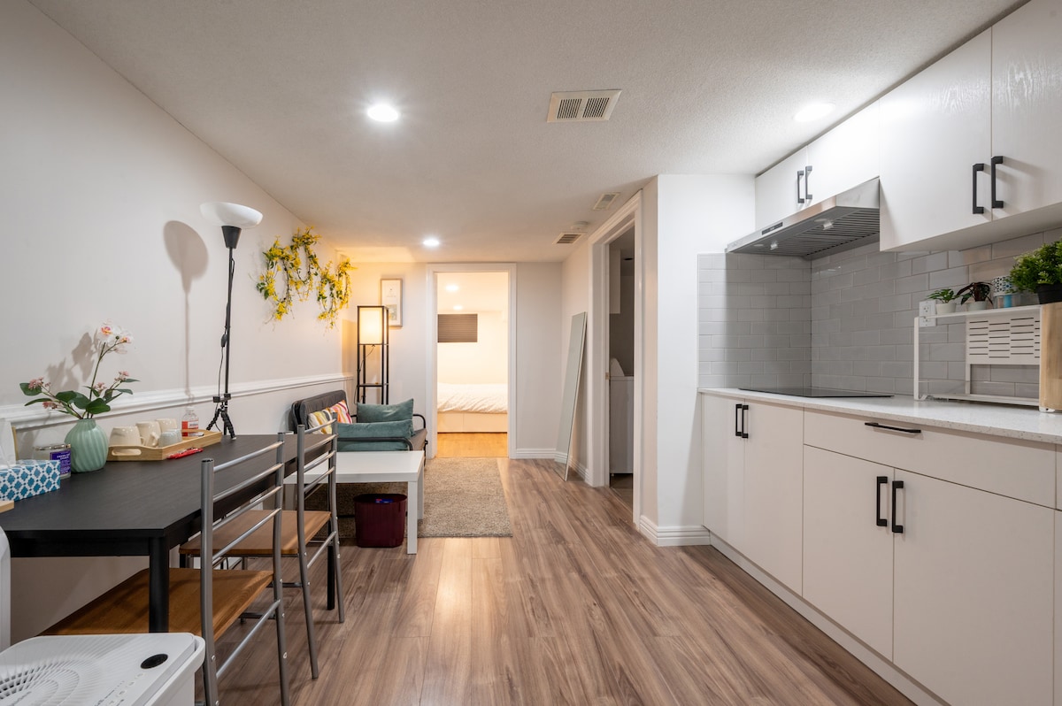 · Snowless Parking, 1 bed 1 bath, 1 living room, with full laundry and kitchen, refrigerator of course! and they are exclusively for your use! · Comfy environment with queen-size bed, cozy vibe, as well as keypad entrance to secure your safety. · Located in a quiet neighborhood. 1 minute to forest park and run field. · Provide 1 parking. 3 mins walk to bus stops. 10 mins drive to Highway 401. · Escape the busy and relax in this your premium highly privacy little basement apartment.