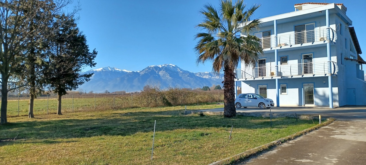 Tá mo theach suite go ciúin i lár páirceanna thart ar 1900 méadar ón trá ghainmheach álainn idir sráidbhailte turasóireachta Paralia agus Trá Oilimpeach le go leor bialanna agus siopaí. Tá réadmhaoin 4950 méadar cearnach sa teach agus tá go leor páirceála ann. Tá sé tugtha go fial agus tá teilifís satailíte chomh maith le córas aláraim agus aeráid. Ar maidin feicfidh tú éirí iontach na gréine thar an bhfarraige ón leaba. Tá an Olympus thart ar 18 km i bhfad.
