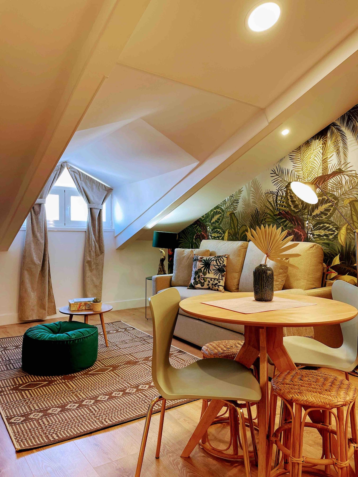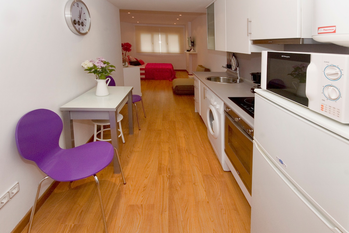 Lochta geal teolaí i gcroílár Malasaña, ceann de na comharsanachtaí is bríomhaire agus is cruthaithí i Maidrid. Le 40 m², síleálacha arda, agus bíomaí adhmaid nochta, tá atmaisféar te, lán le carachtair ann. Cuimsíonn sé cistin lánfheistithe, áit chónaithe ina bhfuil tolg, leaba chompordach, agus seomra folctha dlúth nuair a úsáidtear é le linn seisiúin grianghraf. Mo stiúideo grianghrafadóireachta ar dtús, coinníonn sé a leagan amach oscailte, a spiorad ealaíonta, agus a dhraíocht uathúil, foirfe do shaoirí gearra lánúineacha.