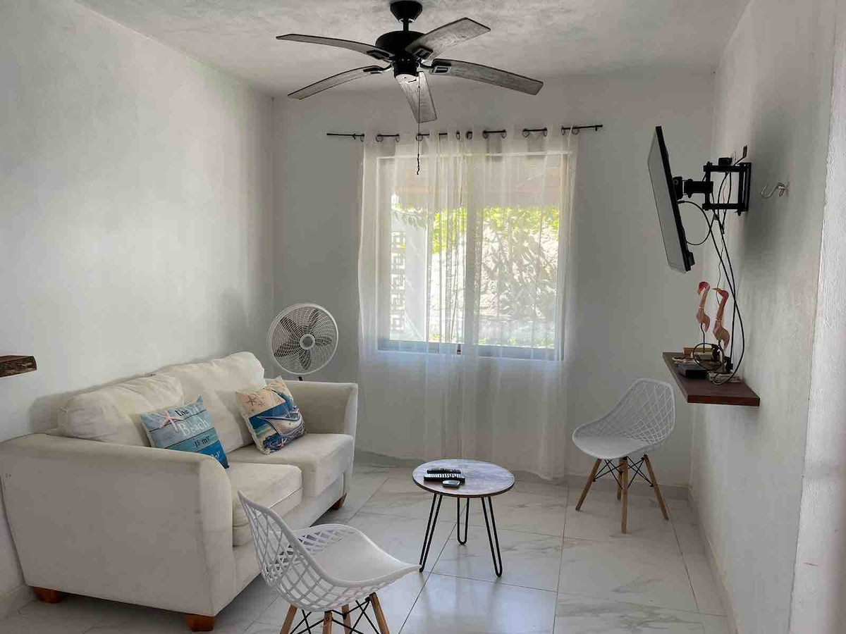 Bain sult as Trá Telchac, atá suite ar an 3ú hurlár, máistirsheomra leapa fairsing ina bhfuil spás chun oibriú ó chian. Ardán os comhair na farraige agus luí na gréine. Cistin lánfheistithe le sorn, oigheann, meaisín caife, srl. Níochán, meaisín níocháin agus triomadóir(le haghaidh tréimhsí fanachta níos faide ná seachtain amháin amháin). Wi - Fi an - tapa ionas gur féidir leat fanacht ceangailte nó oibriú. Linn snámha don fhoirgneamh le casóga agus leapacha gréine. Níl sé suite ach bloc amháin ón trá, achar siúil 10 nóiméad go dtí lár an bhaile.