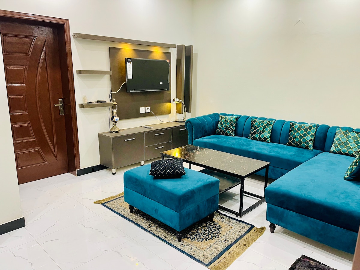 Fáilte go dtí ár mBaile. "Compord Nua - Aimseartha & Stylish" 14 teach Marla 1) Grand TV Lounge ( 55inch Smart LED TV) 1) Seomra Líníochta Só 2 - Seomraí codlata compordacha le hAerchóiriú. 1) cistin ina bhfuil áit itheacháin, gréithe agus uirlisí 1) limistéar níocháin & seirbhíse Páirceáil laistigh coimeádaí tí chun cúnamh a fháil. - Feistis ghleoite agus chomhaimseartha - Wi - Fi in aisce Foirfe do thaistealaithe atá ag lorg saoire ghearr shuaimhneach. Cuir in áirithe anois é agus faigh blaiseadh den mheascán is fearr de chompord agus de stíl