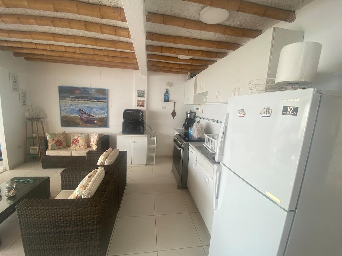 Mini departamento con salon, cuarto con 2 camas matrimoniales frente al mar y cocina con gas.