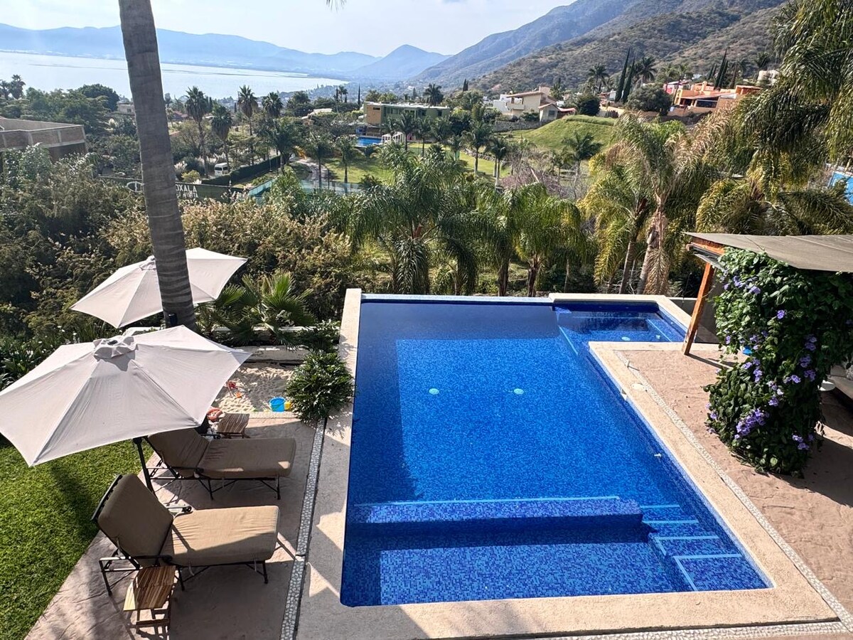 Teach teaghlaigh atá suite idir baile ajijic agus san juan cosala, 1 bhloc ó chladach an locha, tá 5 sheomra agus 9 leaba le hacmhainn do 16 dhuine san áireamh Wi - Fi, linn snámha théite lasmuigh, jacuzzi i máistirsheomra leapa, ardán, áit dóiteáin i 6,000 m2 de ghairdíní, seomra bia lasmuigh, cistin, seomra níocháin le triomadóir agus meaisín níocháin, teilifís i ngach seomra, seomra suí agus staidéar. Foireann chothabhála ar fáil taobh istigh den réadmhaoin 24/7 chun lochtanna seirbhíse a fháil.